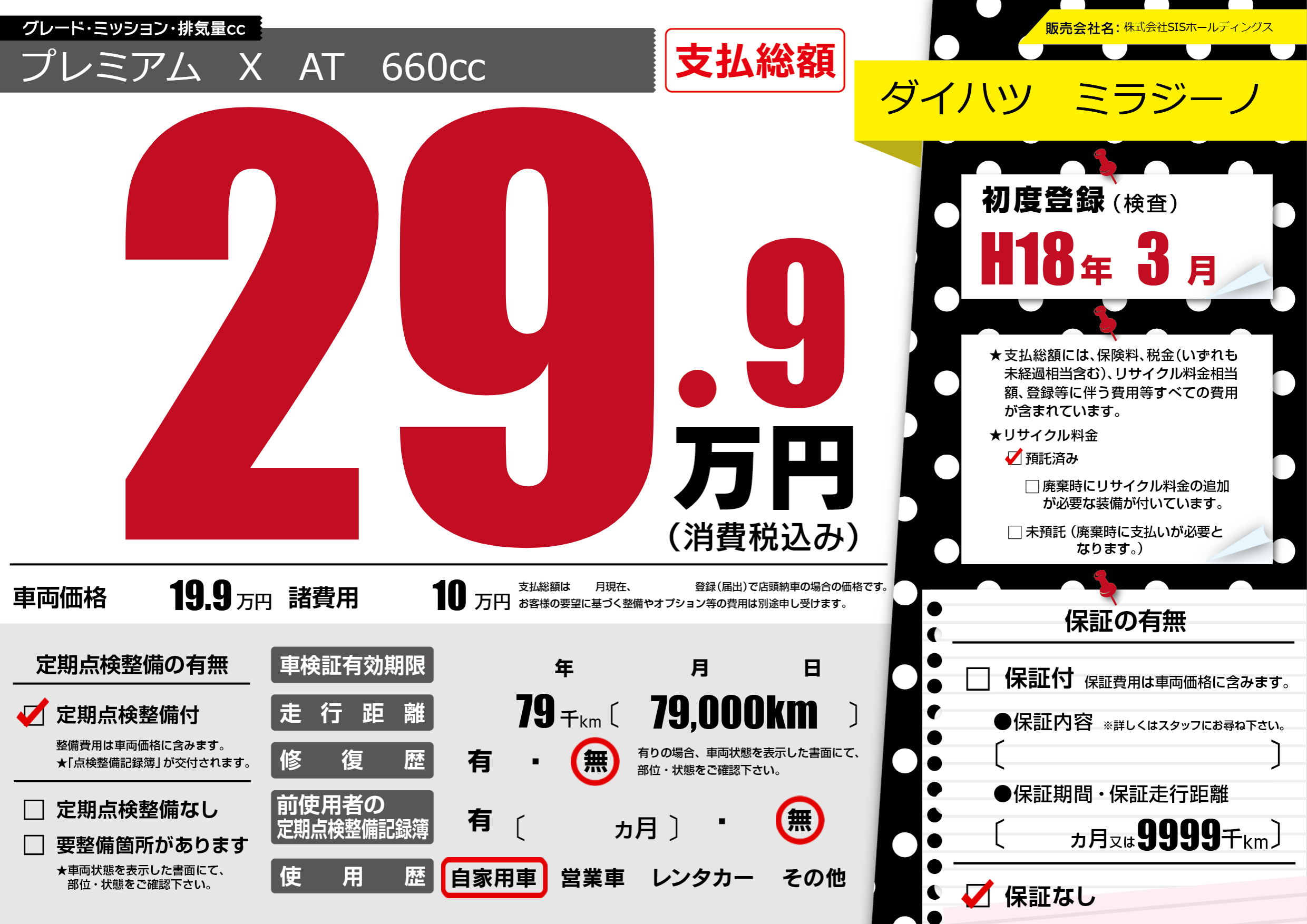 | 走行キロ | 7.9万km | 初年度登録 | H18年3月 |