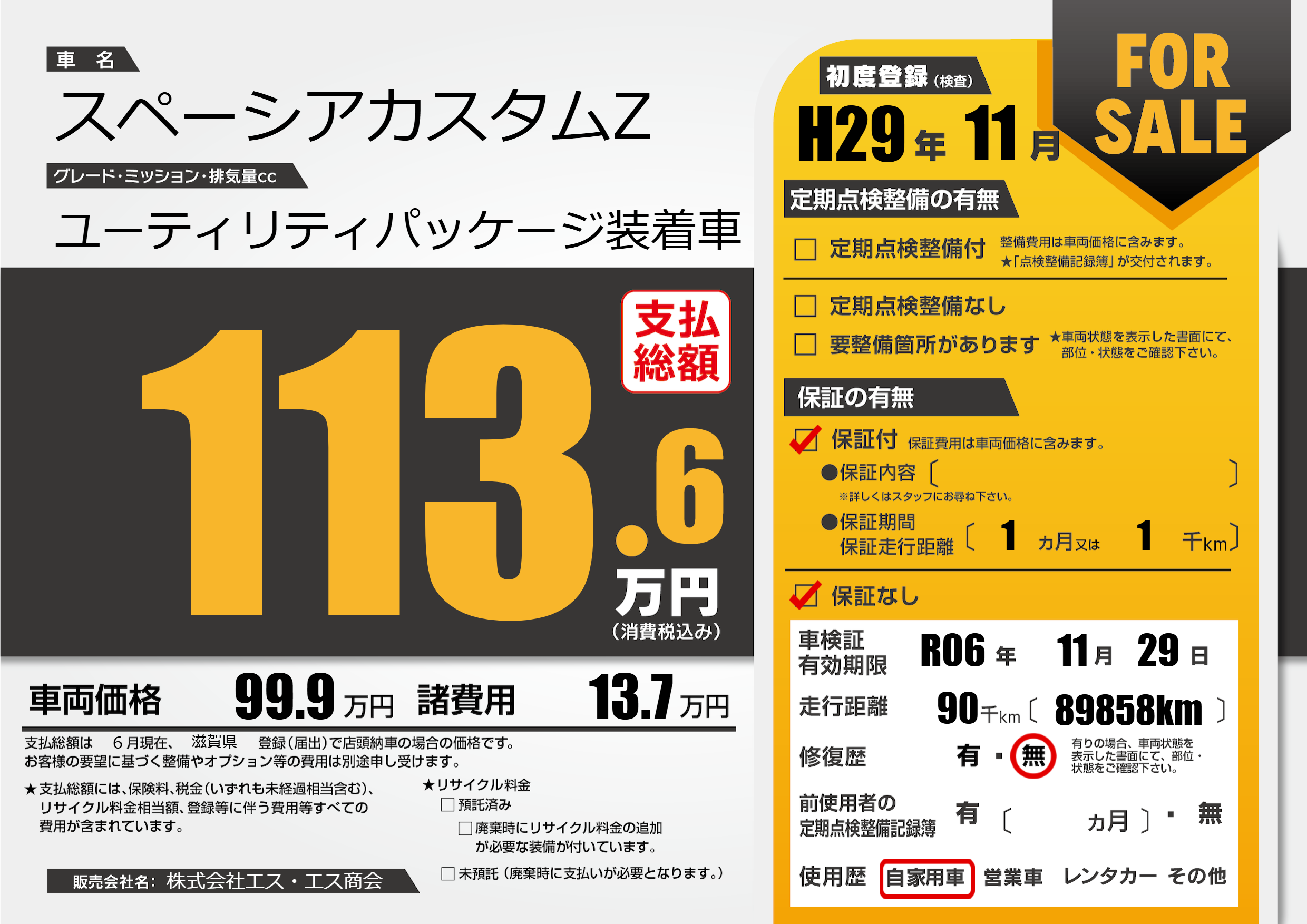| 走行キロ | 9万km | 初年度登録 | H29年11月 |