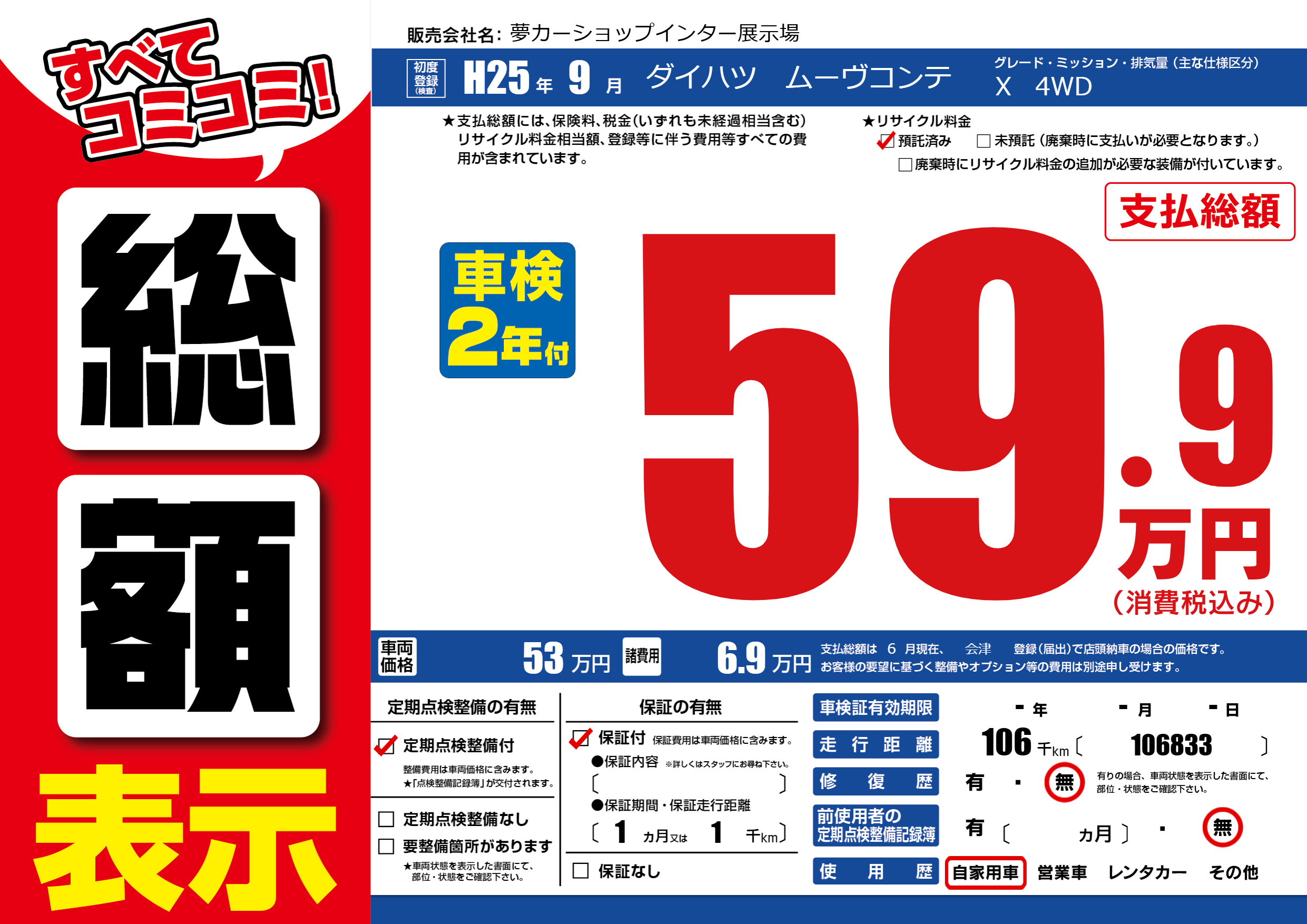 | 車名 | ダイハツ ムーヴコンテ | グレード ミッション 排気量 |