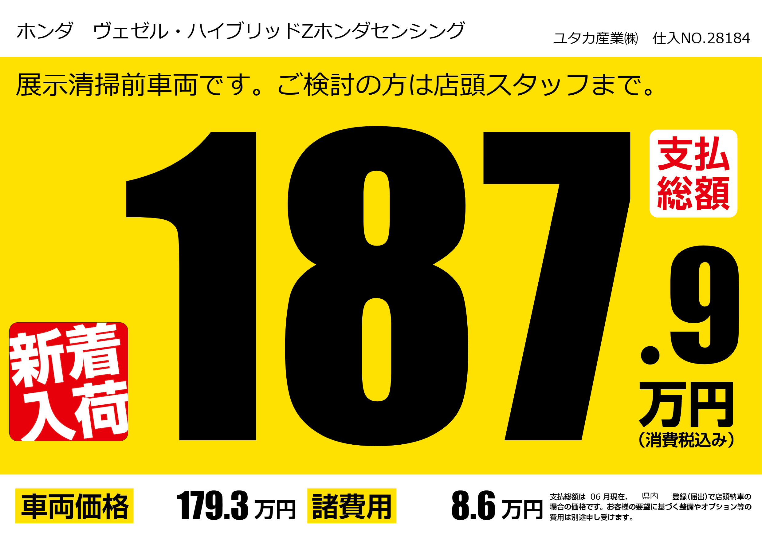 | 車名 | ホンダ ヴェゼル・ハイブリッドZホンダセンシング | グレード ミッション 排気量 |