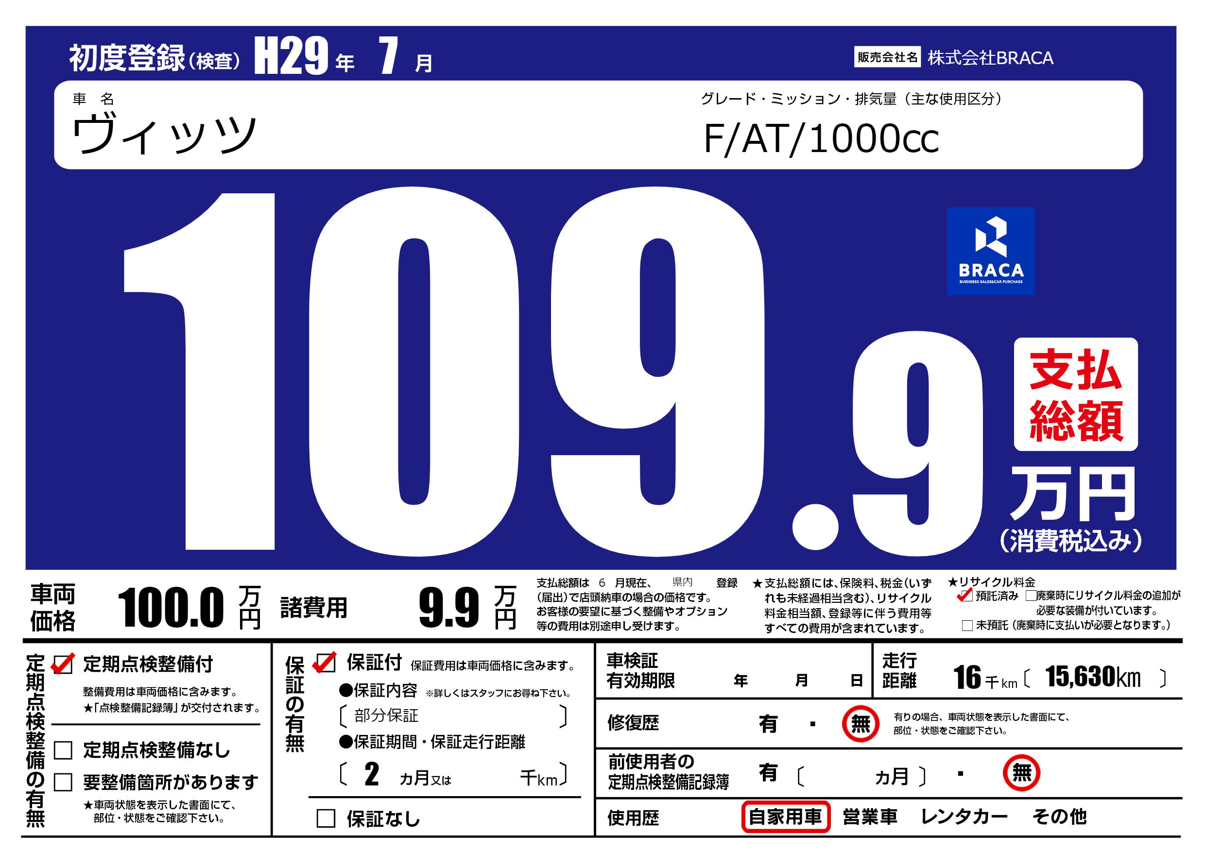 保証付き 保証内容(部分保証) 2ヶ月または()千kmまで |