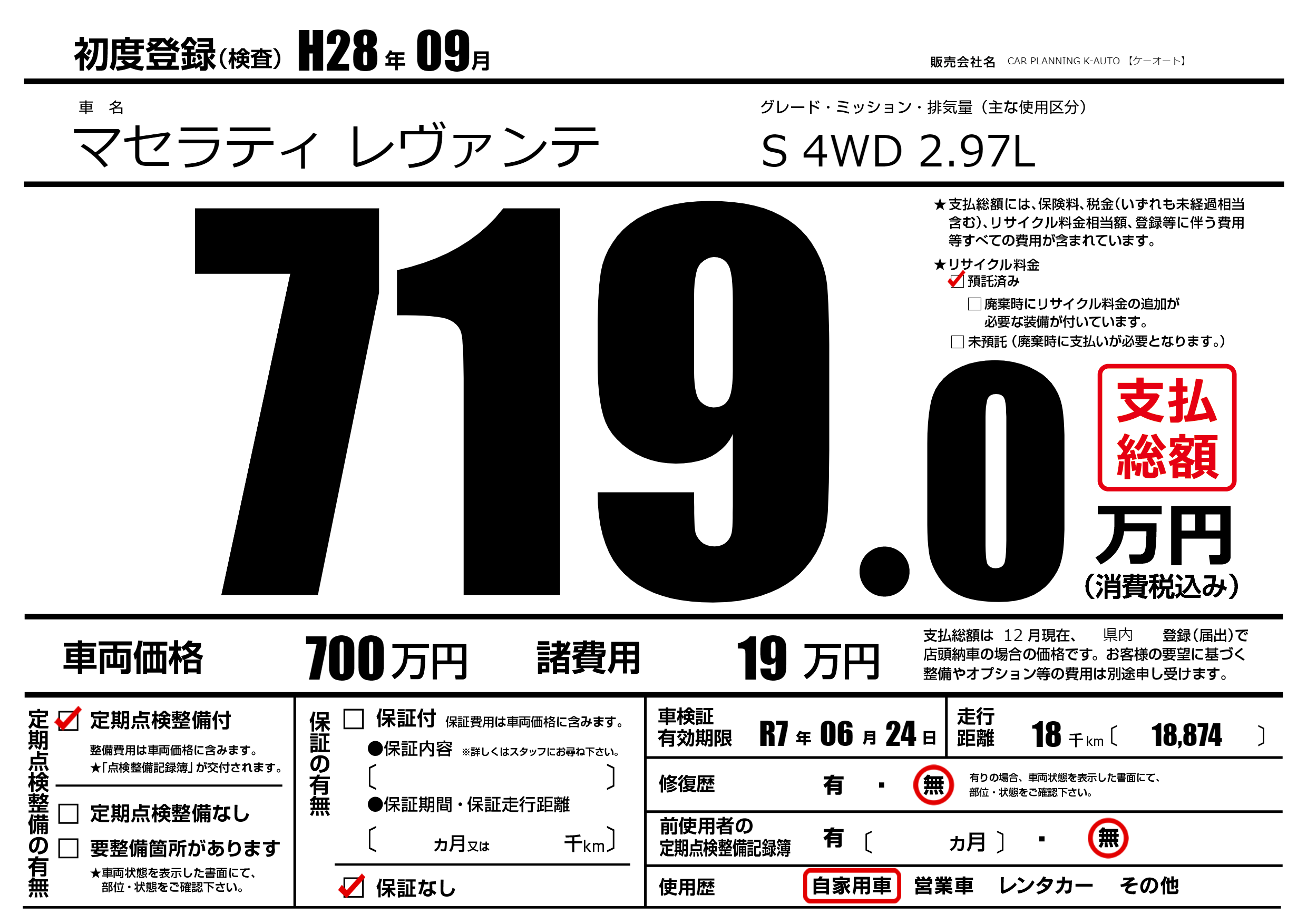 | 車名 | マセラティ レヴァンテ | グレード ミッション 排気量 |