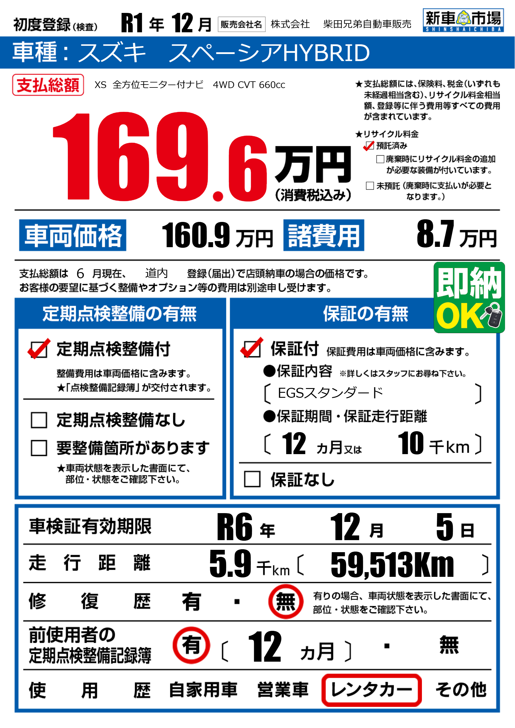 | 車名 | スズキ スペーシアHYBRID | グレード ミッション 排気量 |