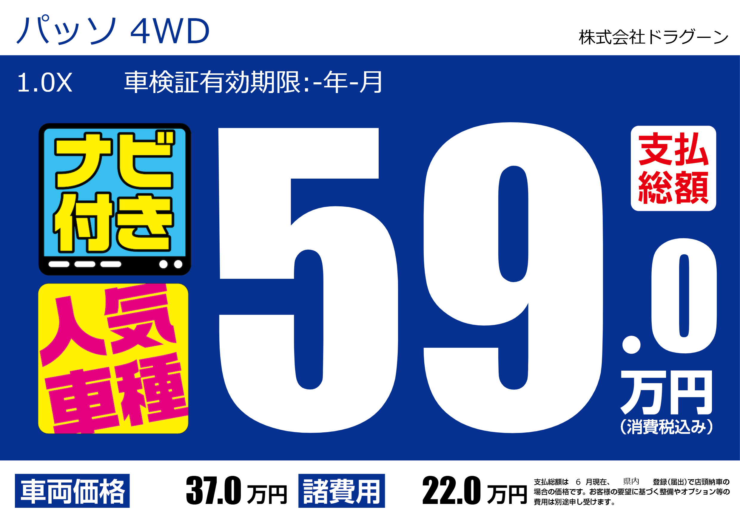 | 車名 | パッソ 4WD | グレード ミッション 排気量 |