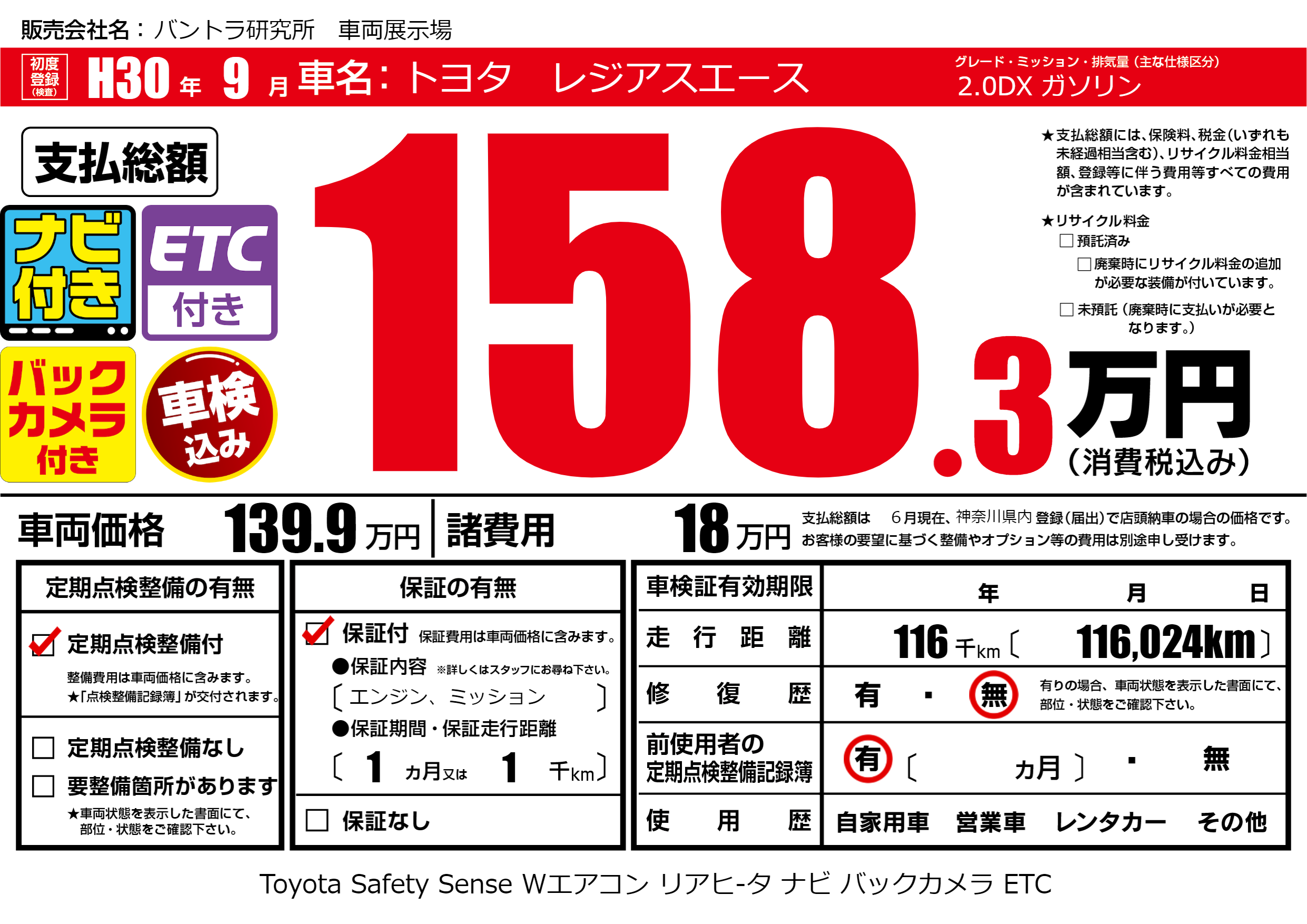 | 走行キロ | 11.6万km | 初年度登録 | H30年9月 |