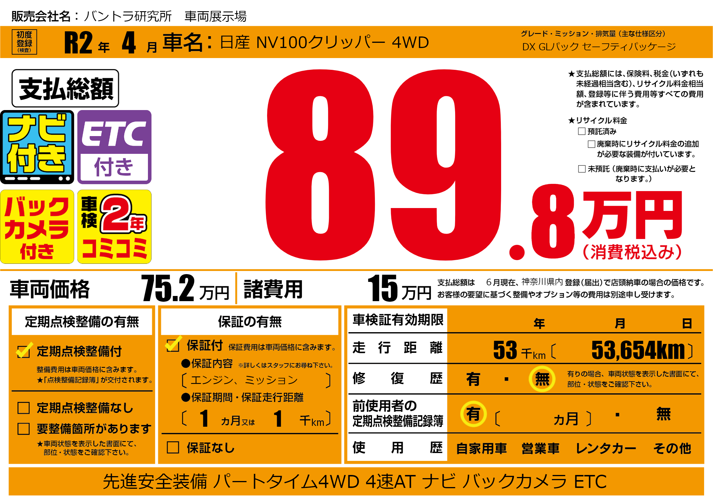 | 車名 | 日産 NV100クリッパー 4WD | グレード ミッション 排気量 |