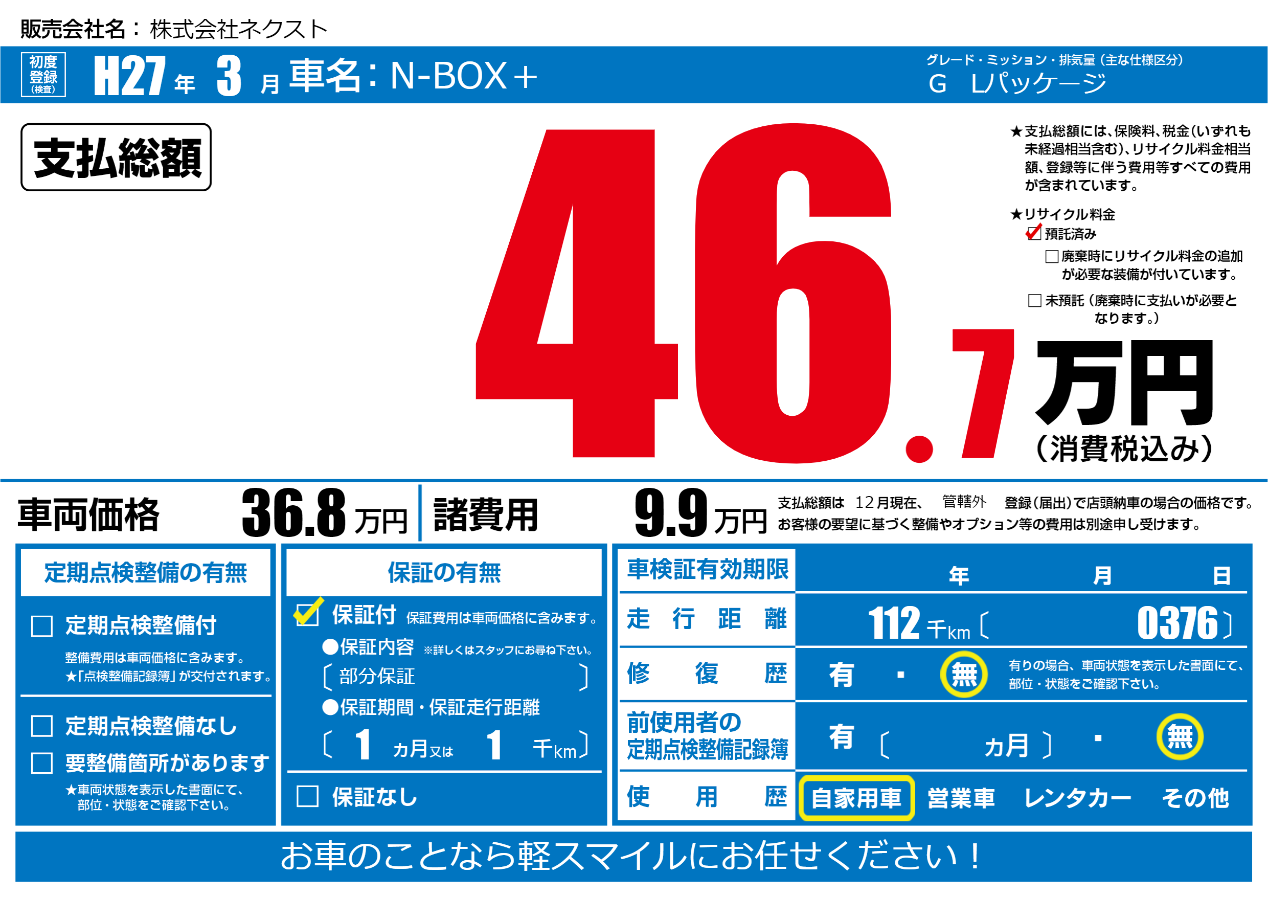 | 車名 | N-BOX+ | グレード ミッション 排気量 |