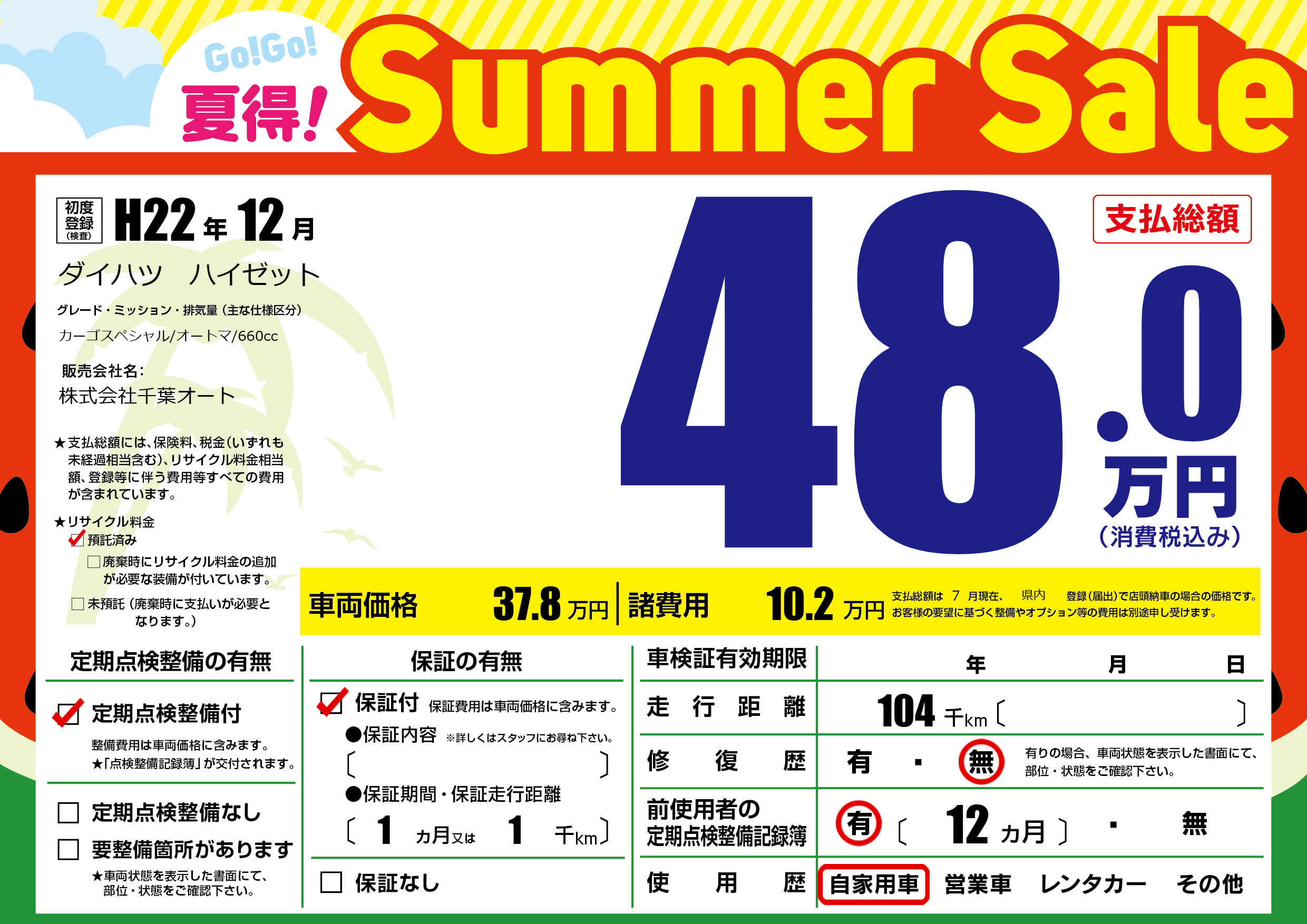 | 走行キロ | 10.4万km | 初年度登録 | H22年12月 |