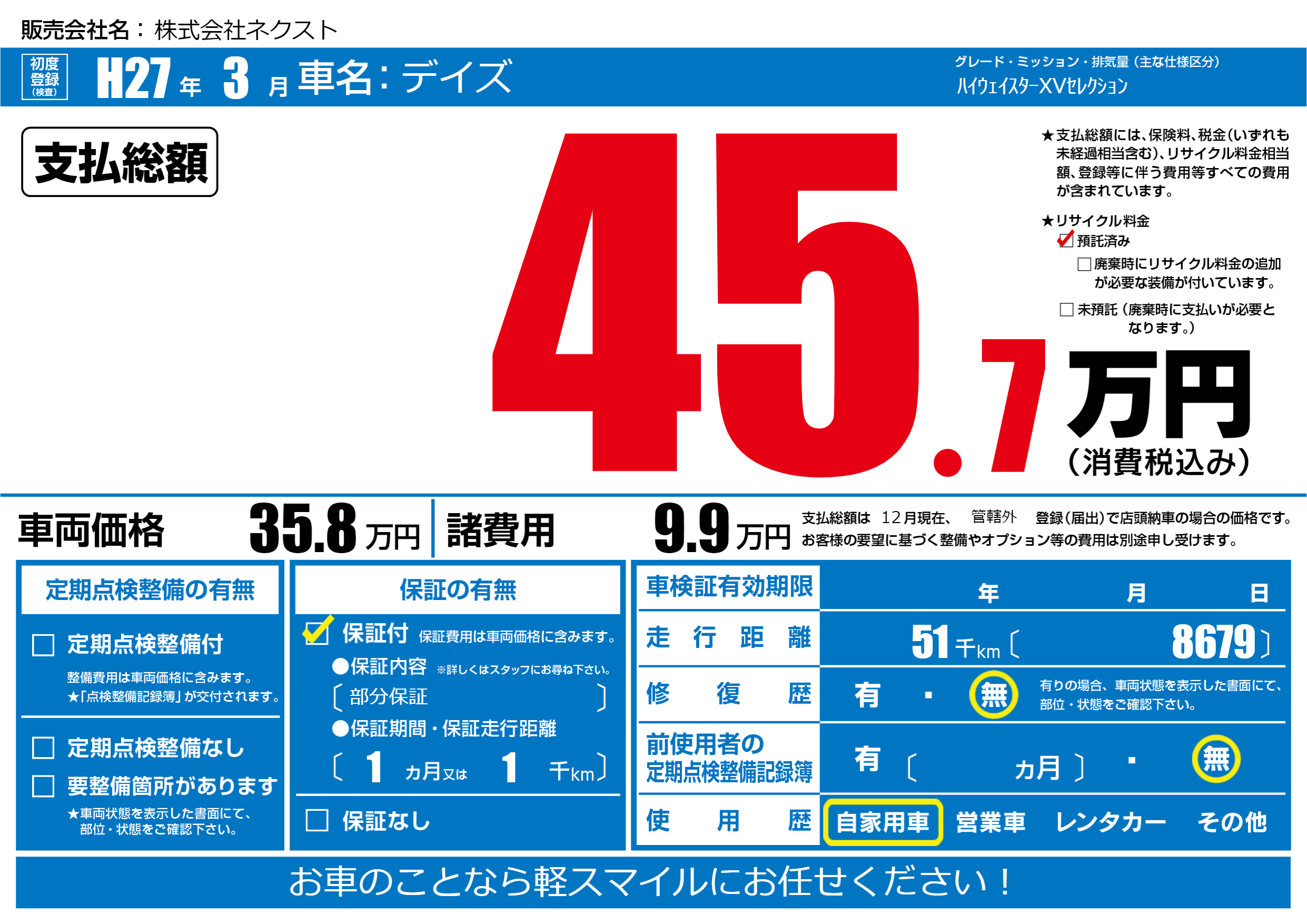 | 走行キロ | 5.1万km | 初年度登録 | H27年3月 |