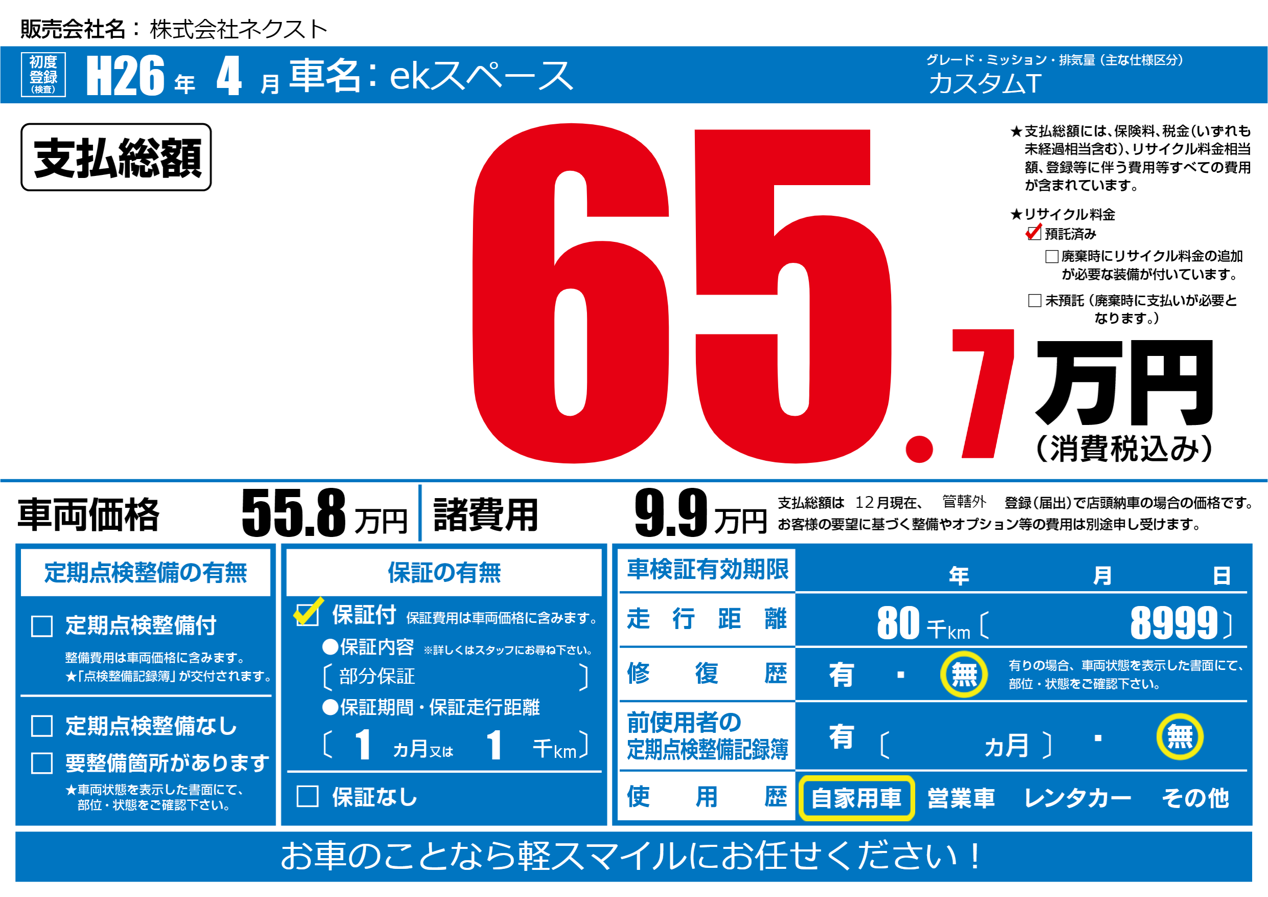 | 走行キロ | 8万km | 初年度登録 | H26年4月 |
