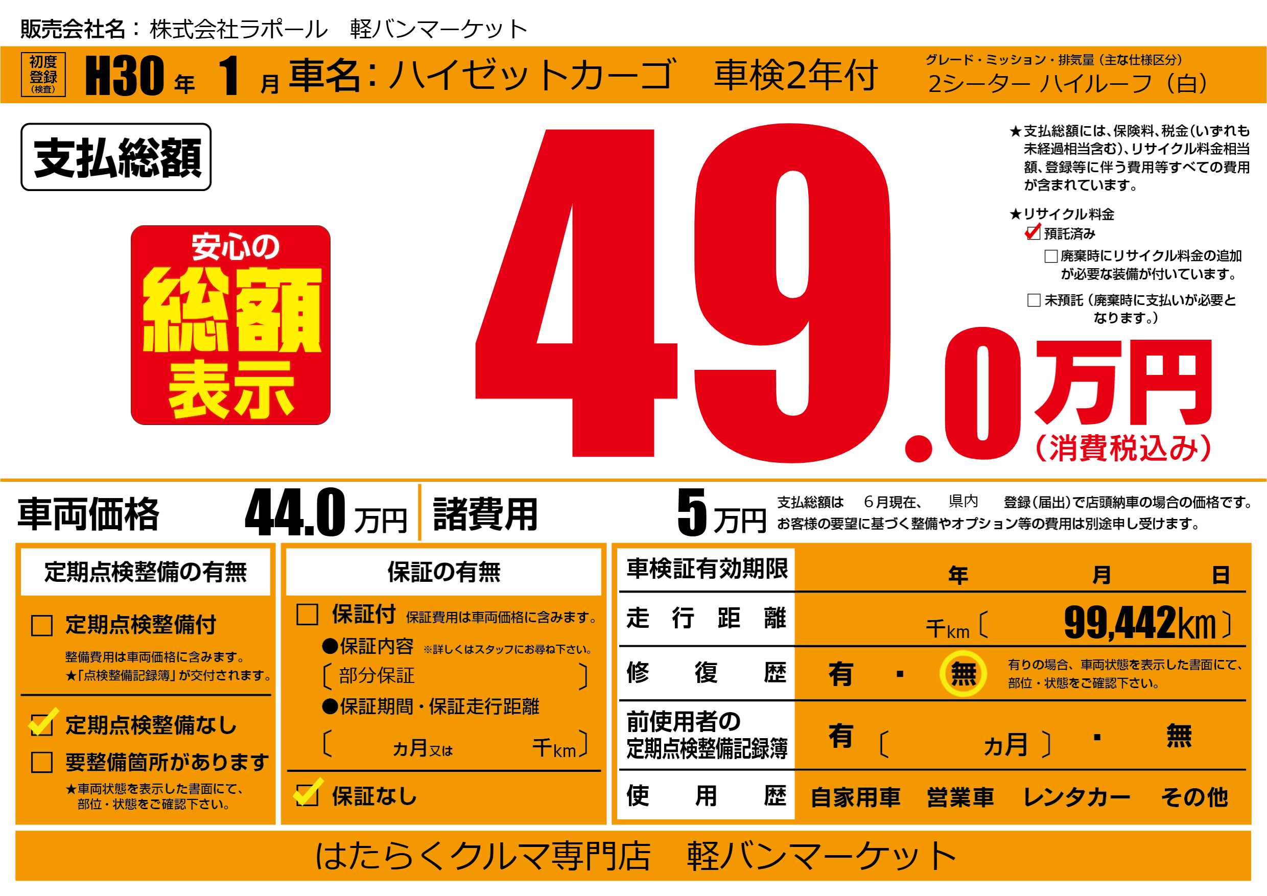 保証なし 保証内容(部分保証) ---ヶ月または()千kmまで |