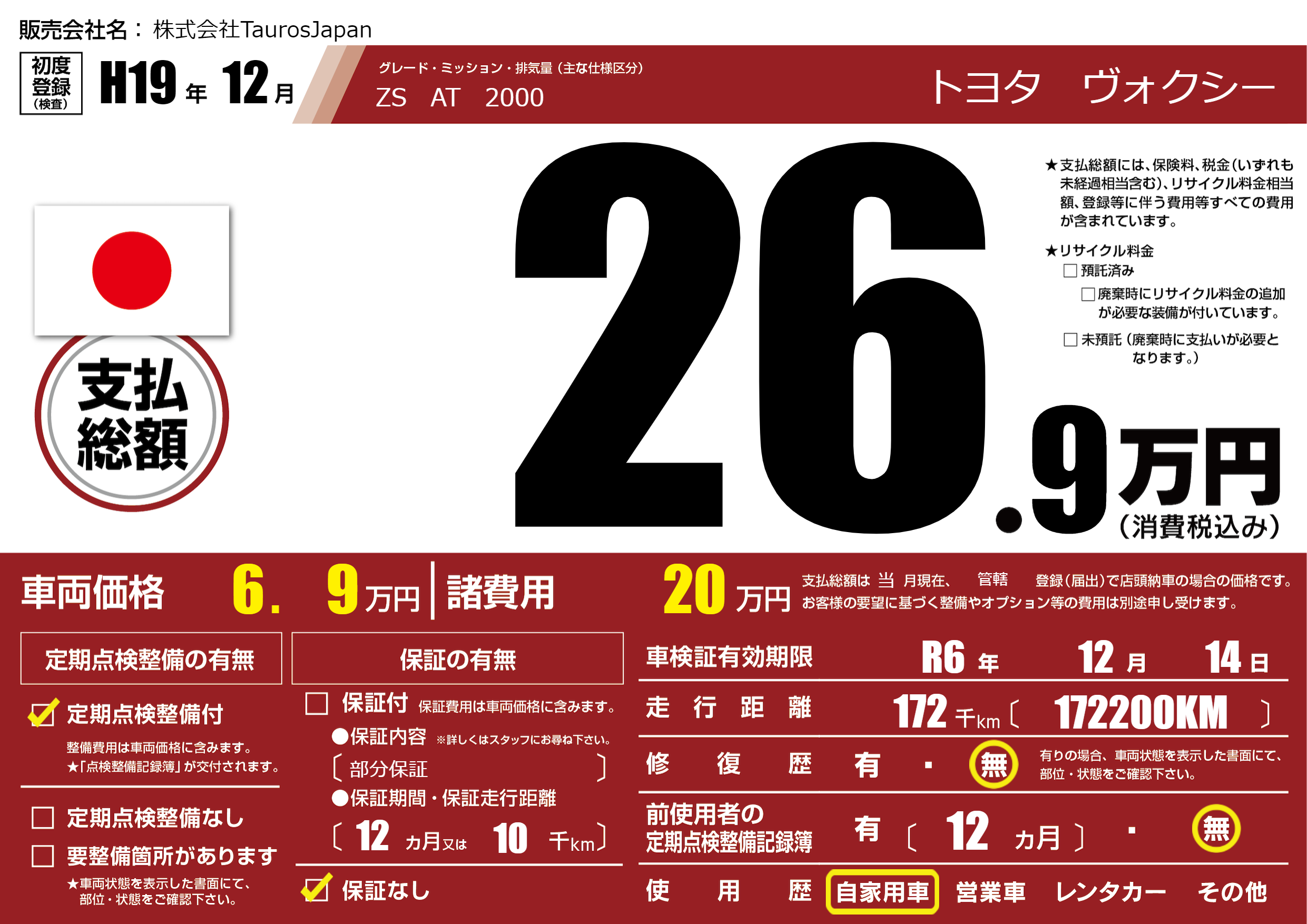 | 車名 | トヨタ ヴォクシー | グレード ミッション 排気量 |