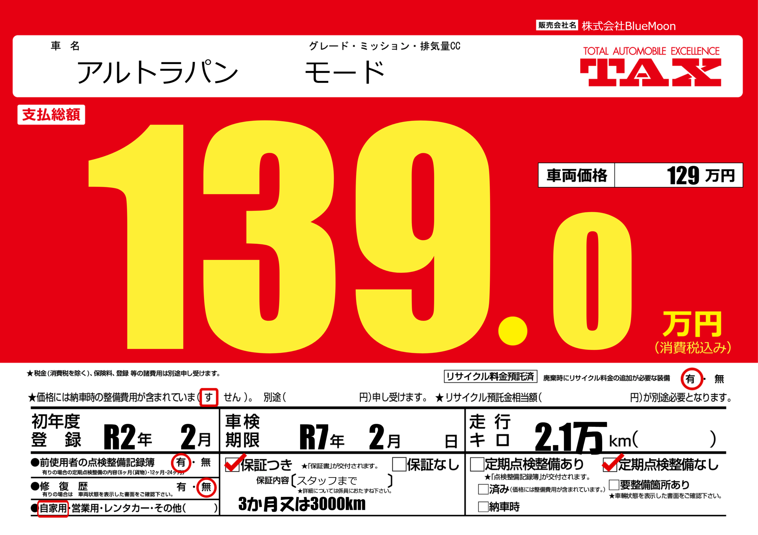 | 走行キロ | 0.2万km | 初年度登録 | R2年2月 |