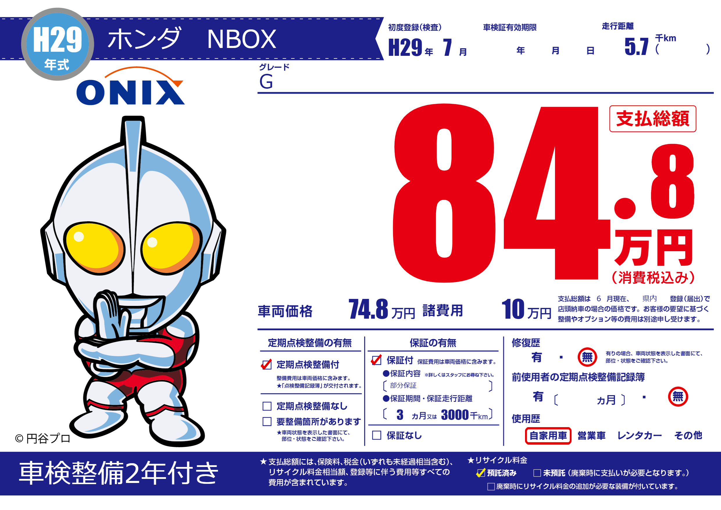 | 車名 | ホンダ NBOX | グレード ミッション 排気量 |