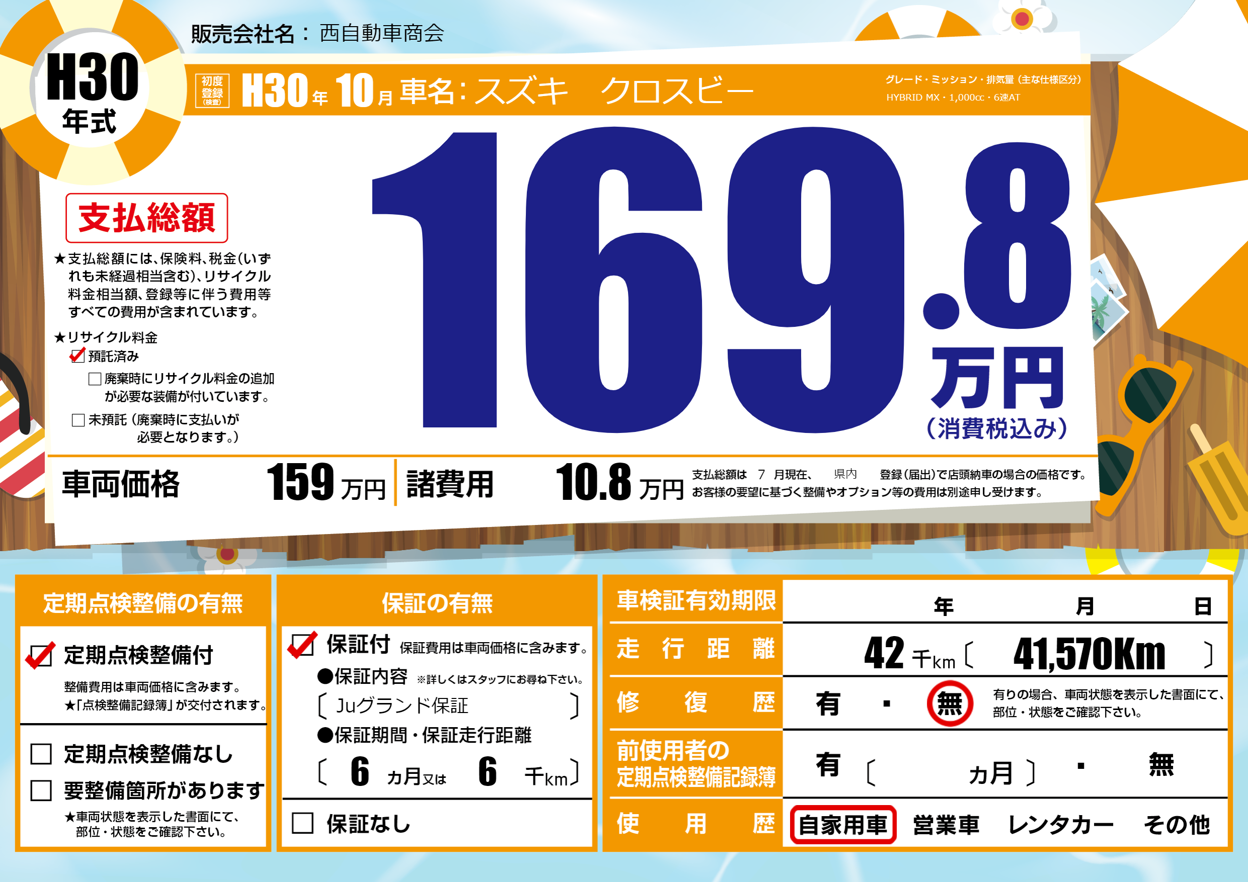 | 車名 | スズキ クロスビー | グレード ミッション 排気量 |