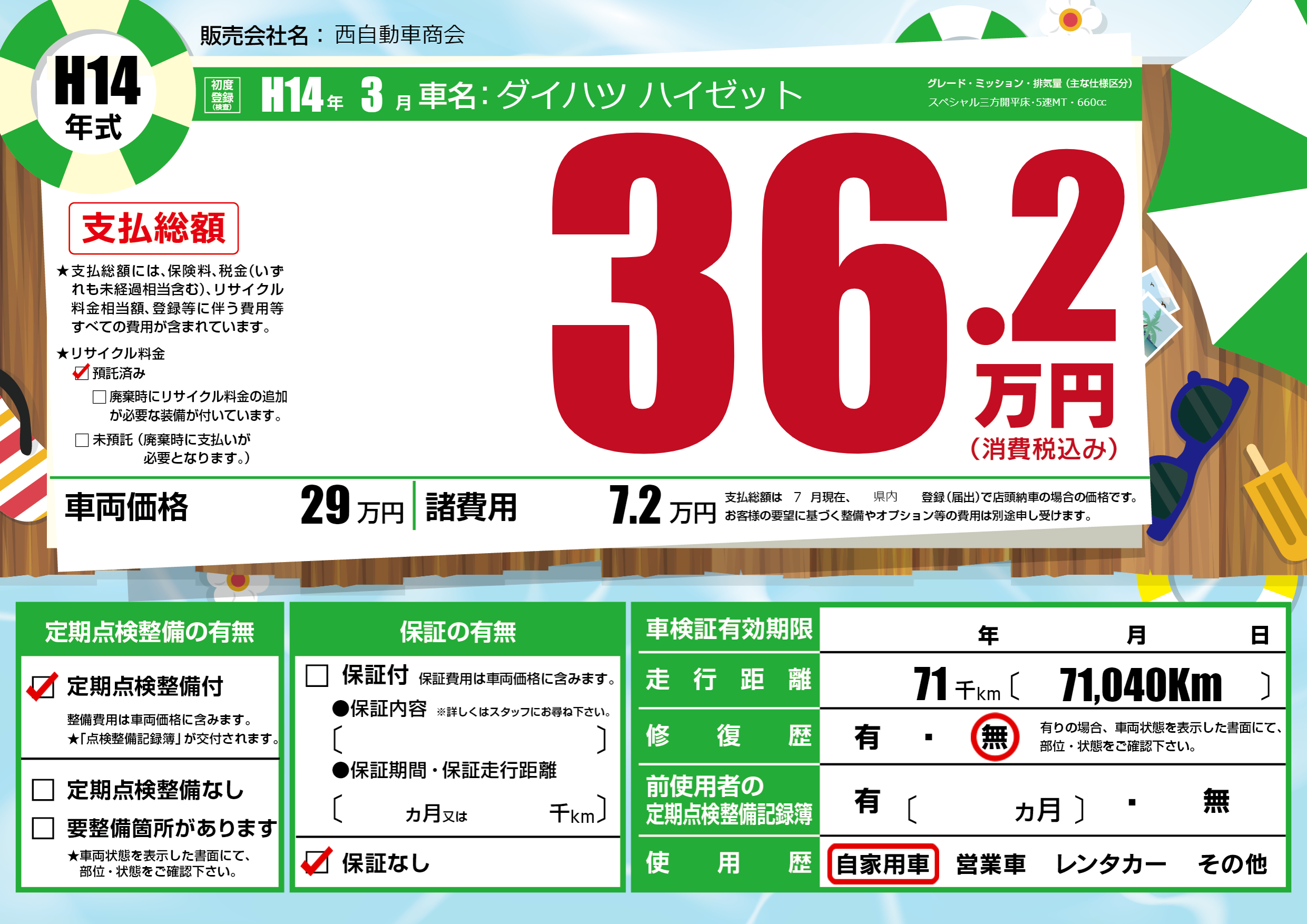 | 走行キロ | 7.1万km | 初年度登録 | H14年3月 |