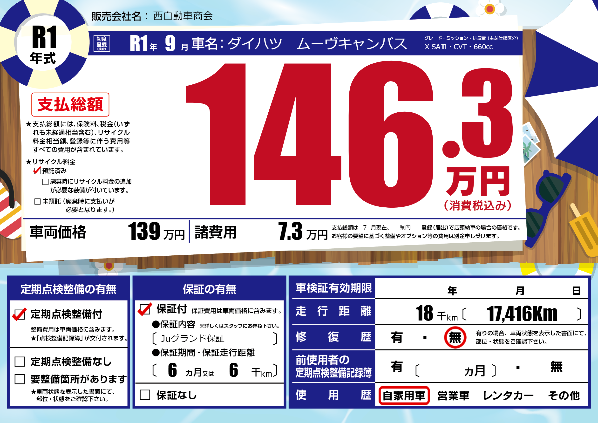 | 走行キロ | 1.8万km | 初年度登録 | R1年9月 |