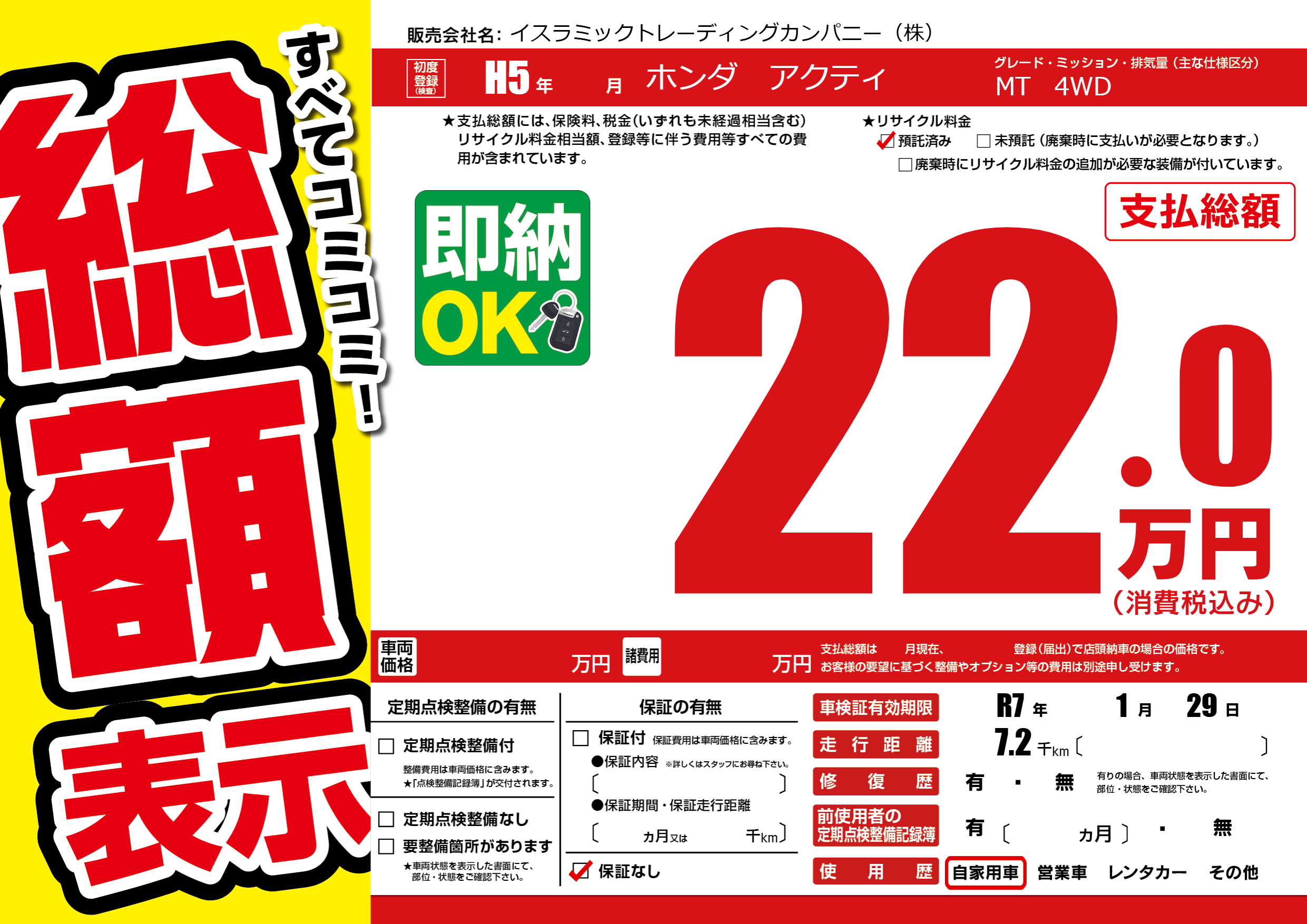 なし | 車検制限 | R7年1月29月 |
