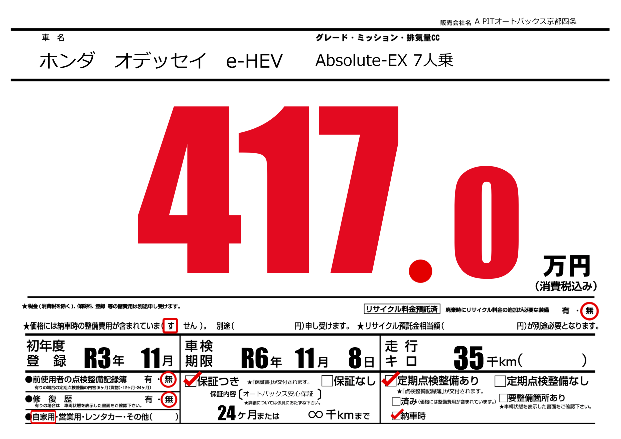 あり | 車検制限 | R6年11月8月 |