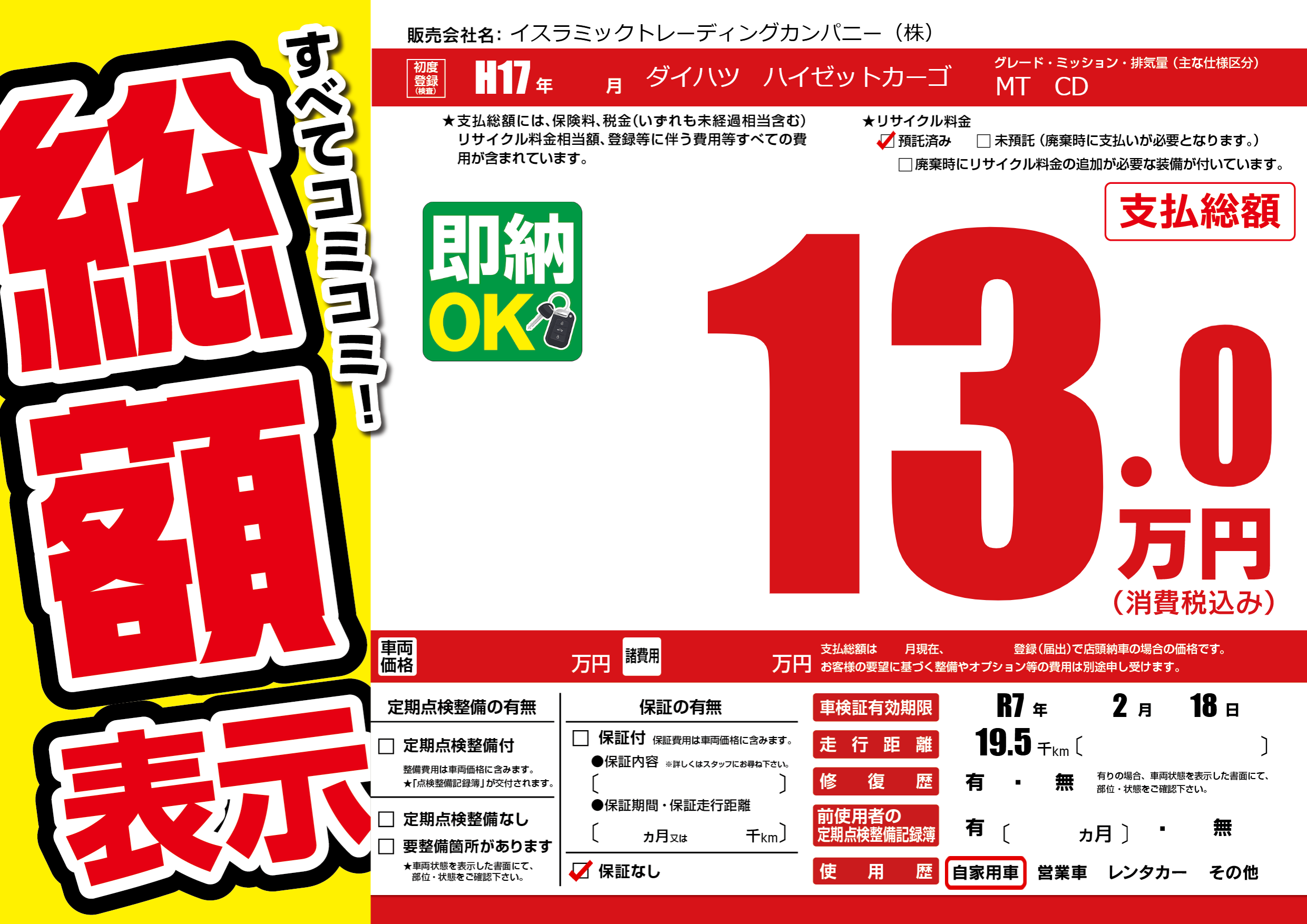 | 車名 | ダイハツ ハイゼットカーゴ | グレード ミッション 排気量 |