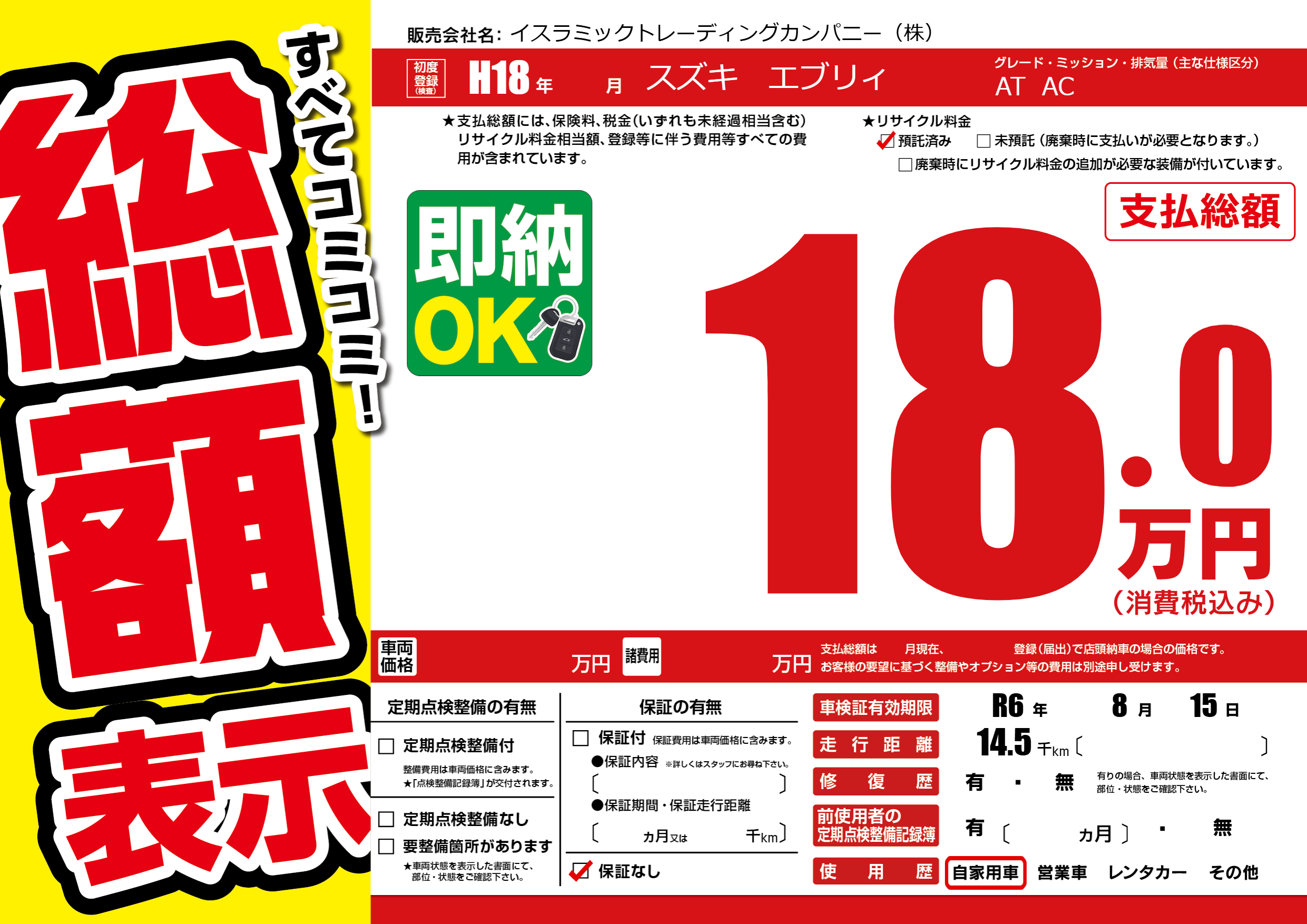 | 車名 | スズキ エブリィ | グレード ミッション 排気量 |