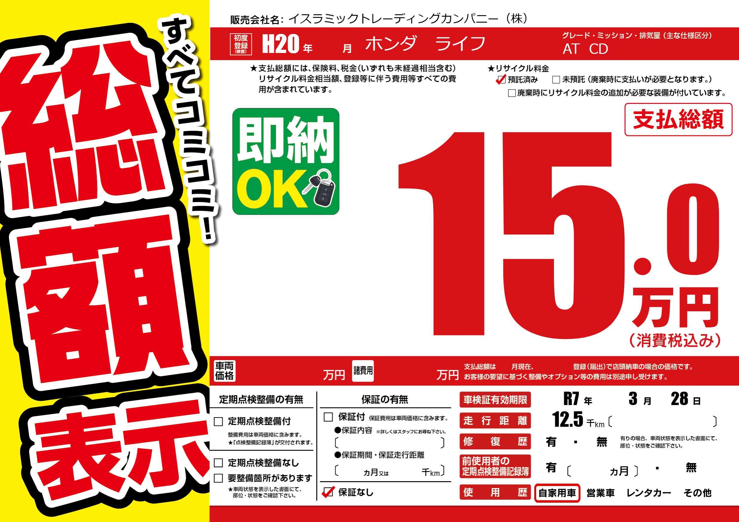 | 車名 | ホンダ ライフ | グレード ミッション 排気量 |