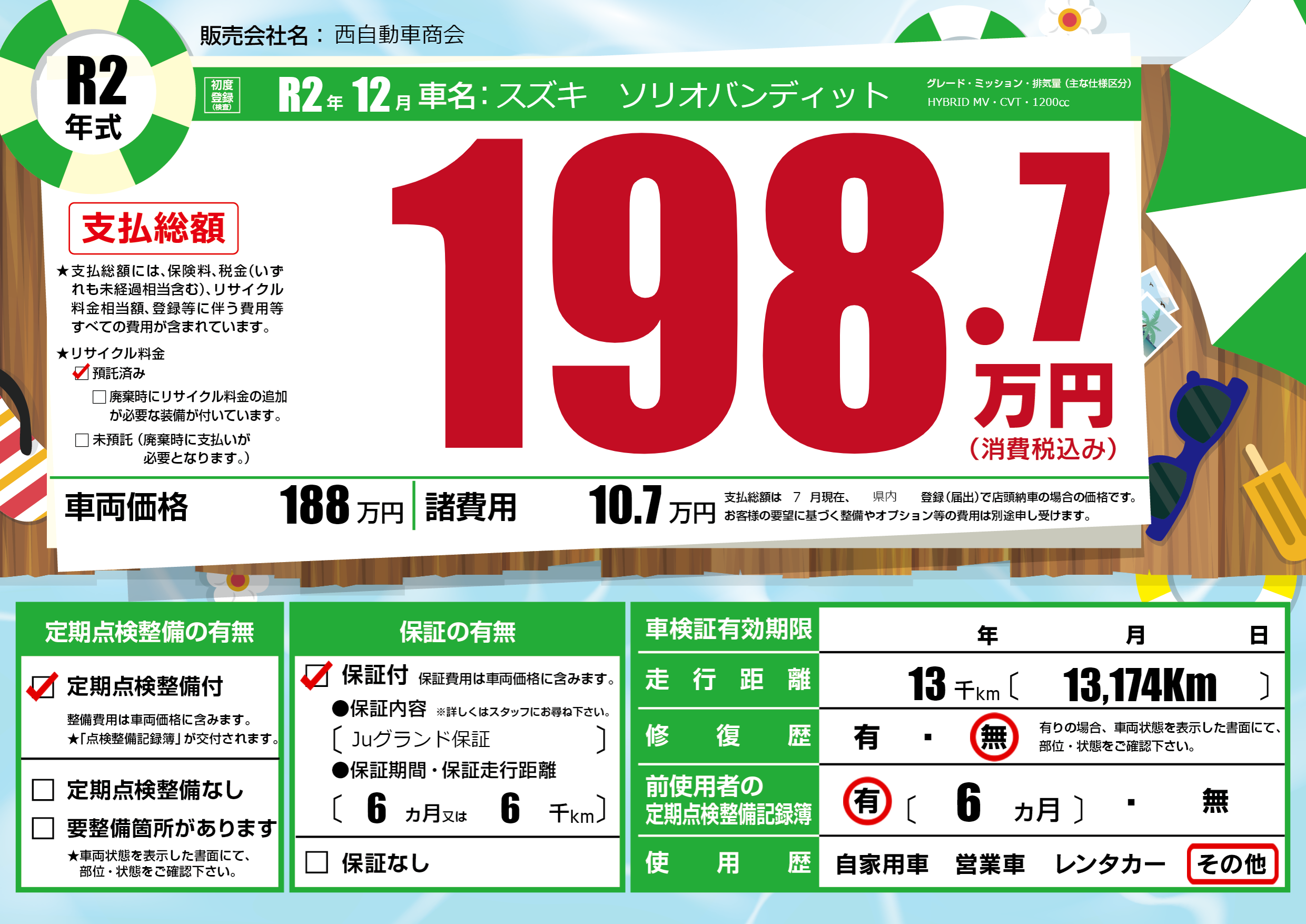 | 車名 | スズキ ソリオバンディット | グレード ミッション 排気量 |