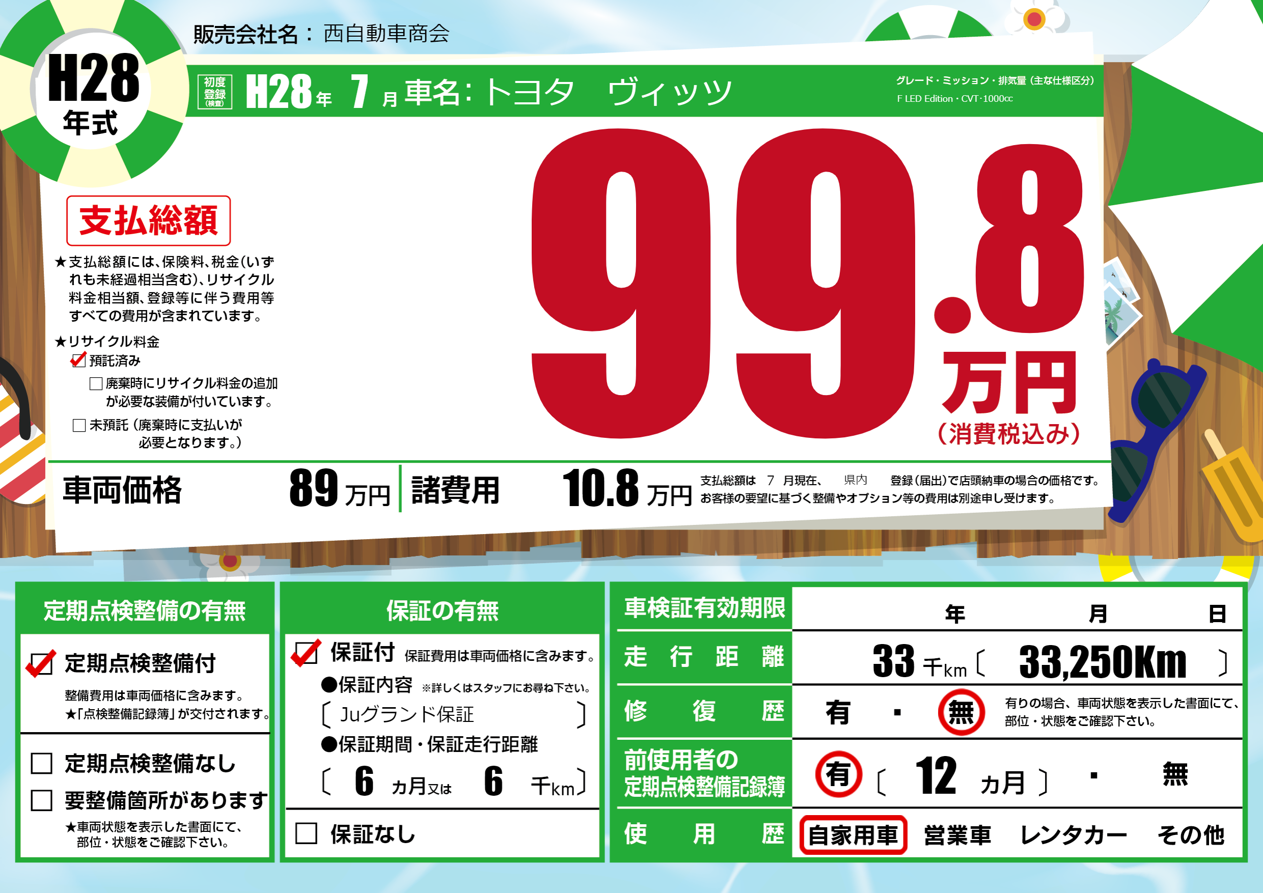 | 走行キロ | 3.3万km | 初年度登録 | H28年7月 |