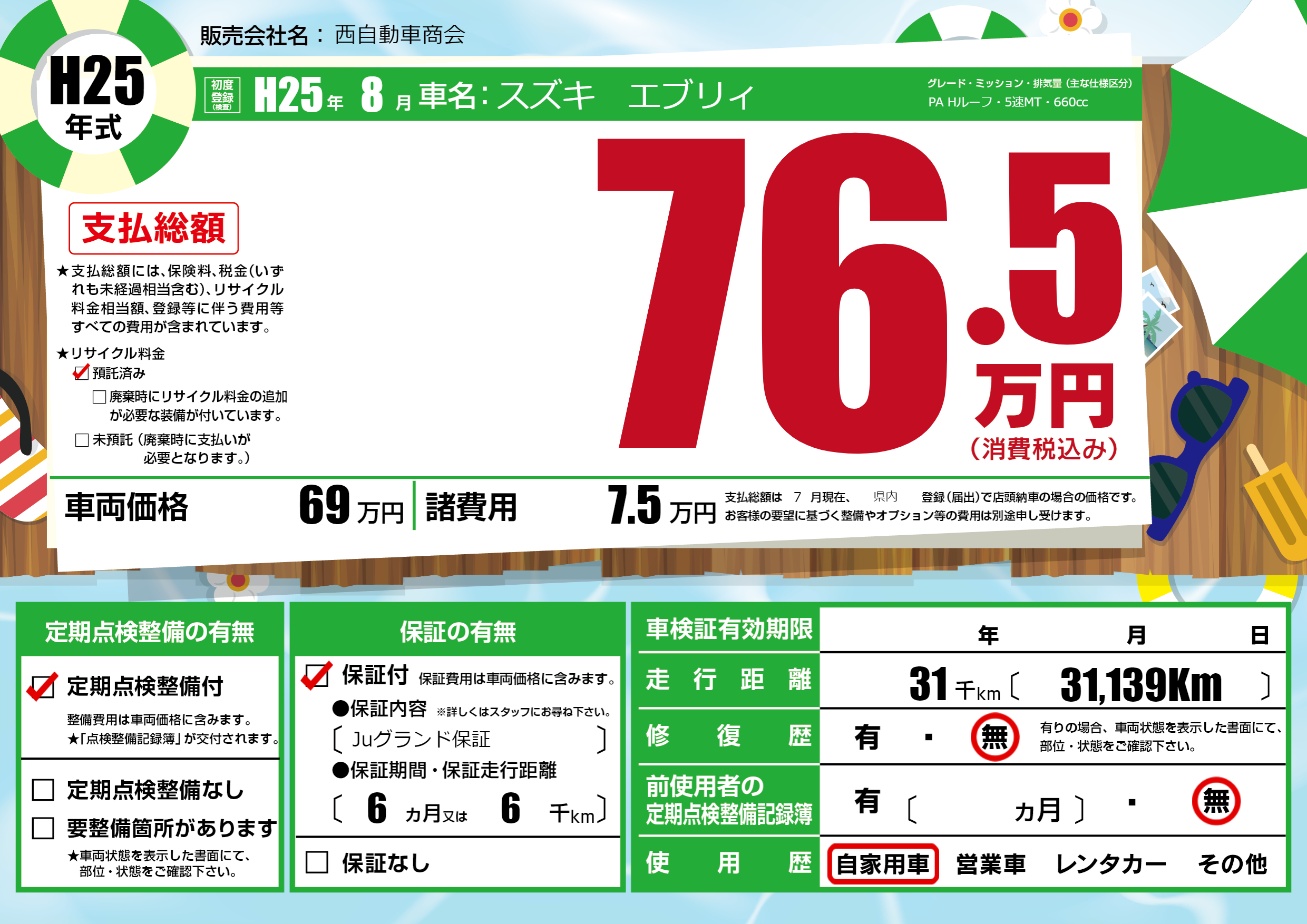 | 走行キロ | 3.1万km | 初年度登録 | H25年8月 |
