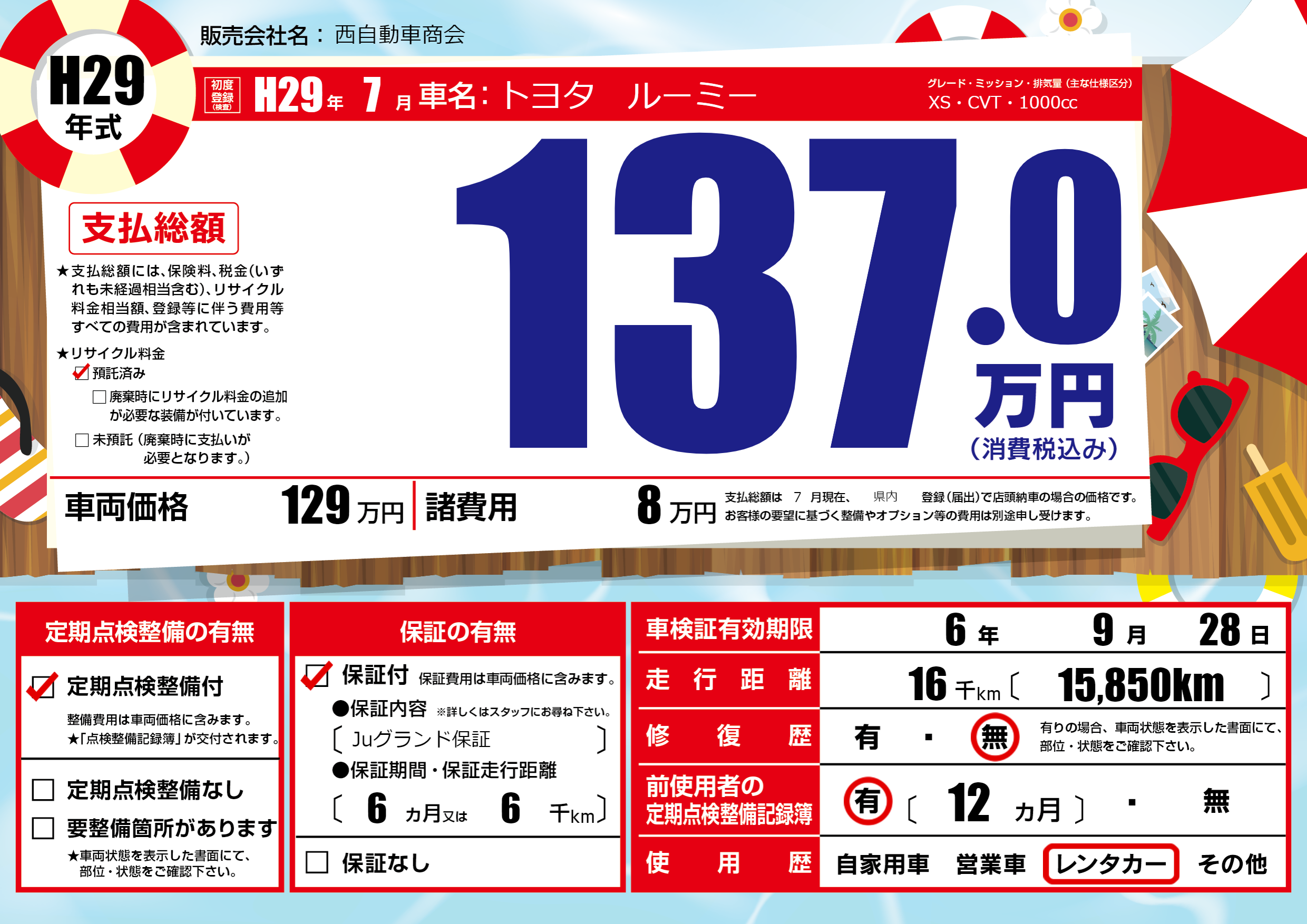 | 車名 | トヨタ ルーミー | グレード ミッション 排気量 |