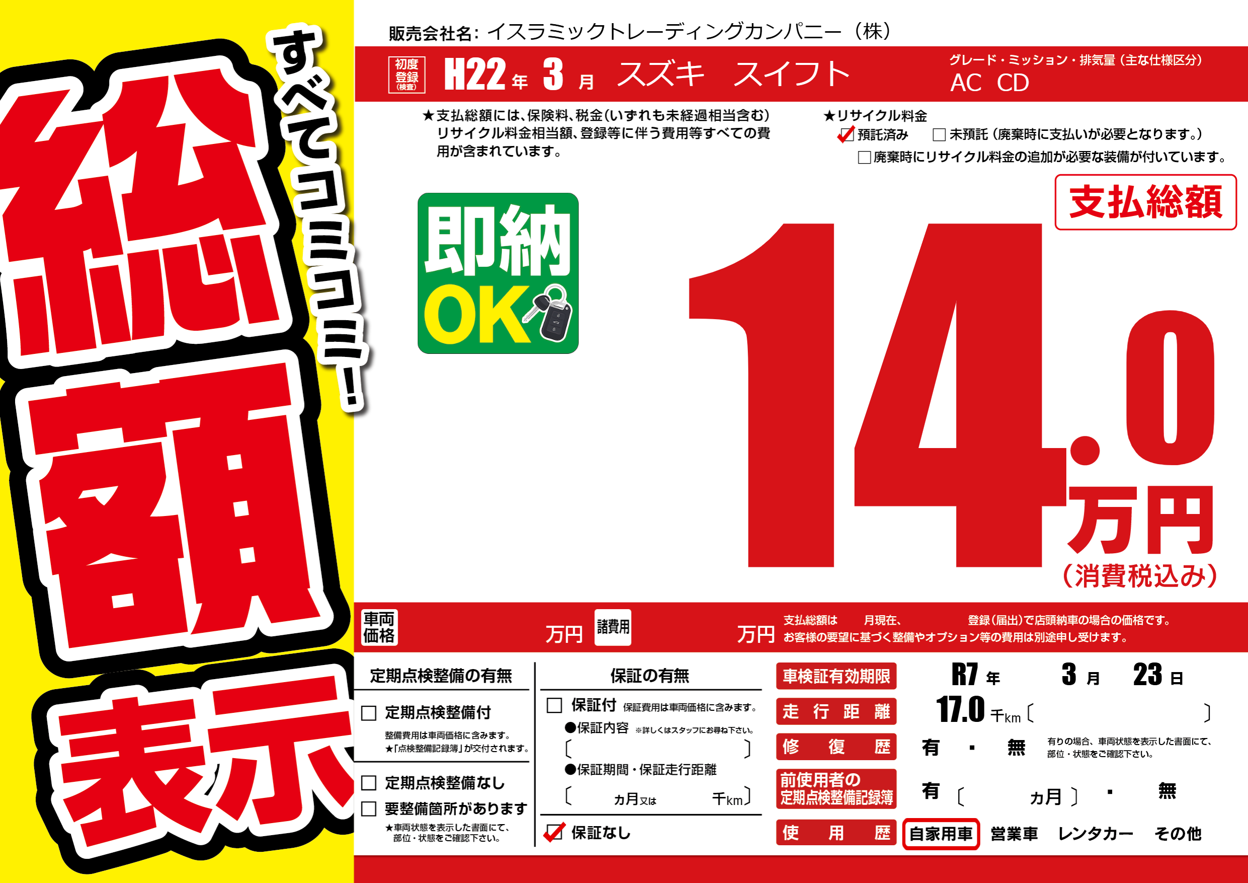 | 車名 | スズキ スイフト | グレード ミッション 排気量 |