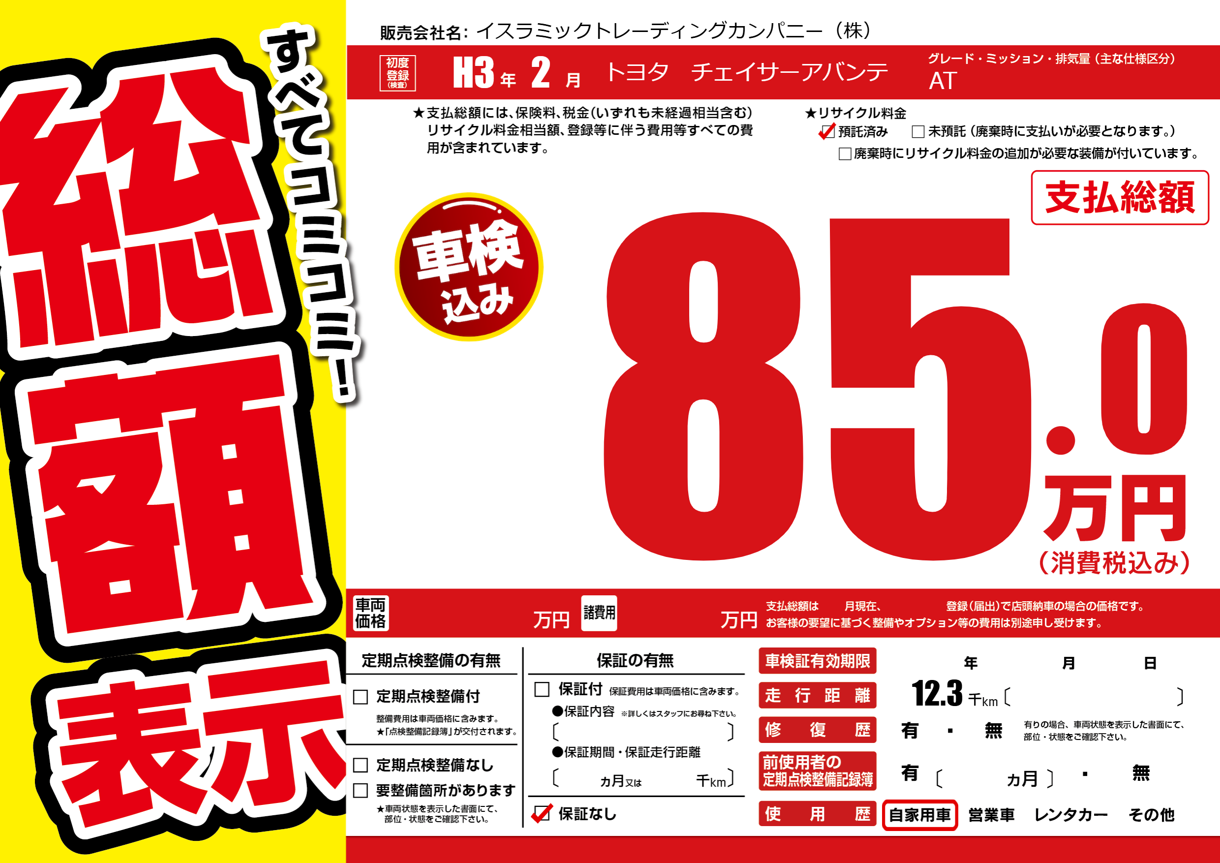 | 車名 | トヨタ チェイサーアバンテ | グレード ミッション 排気量 |