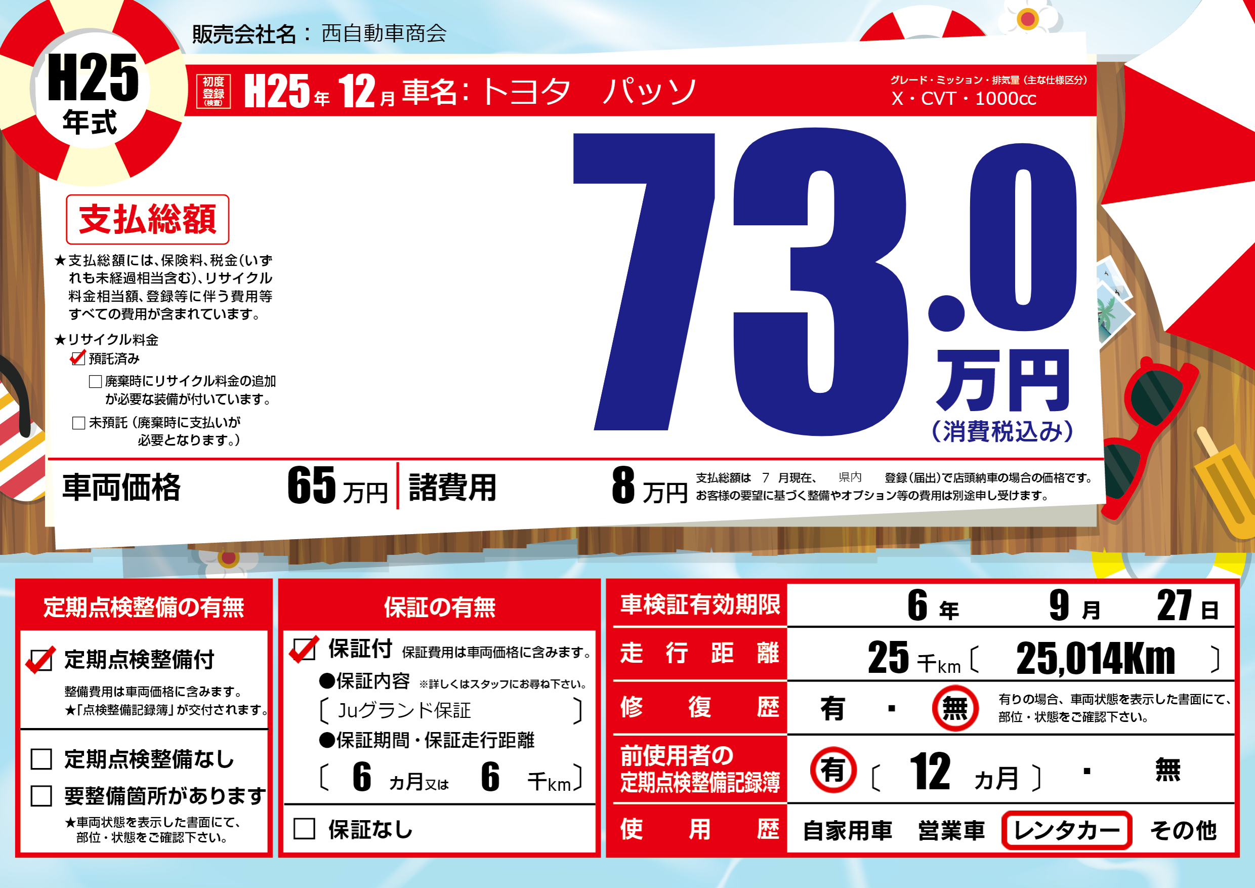 | 車名 | トヨタ パッソ | グレード ミッション 排気量 |