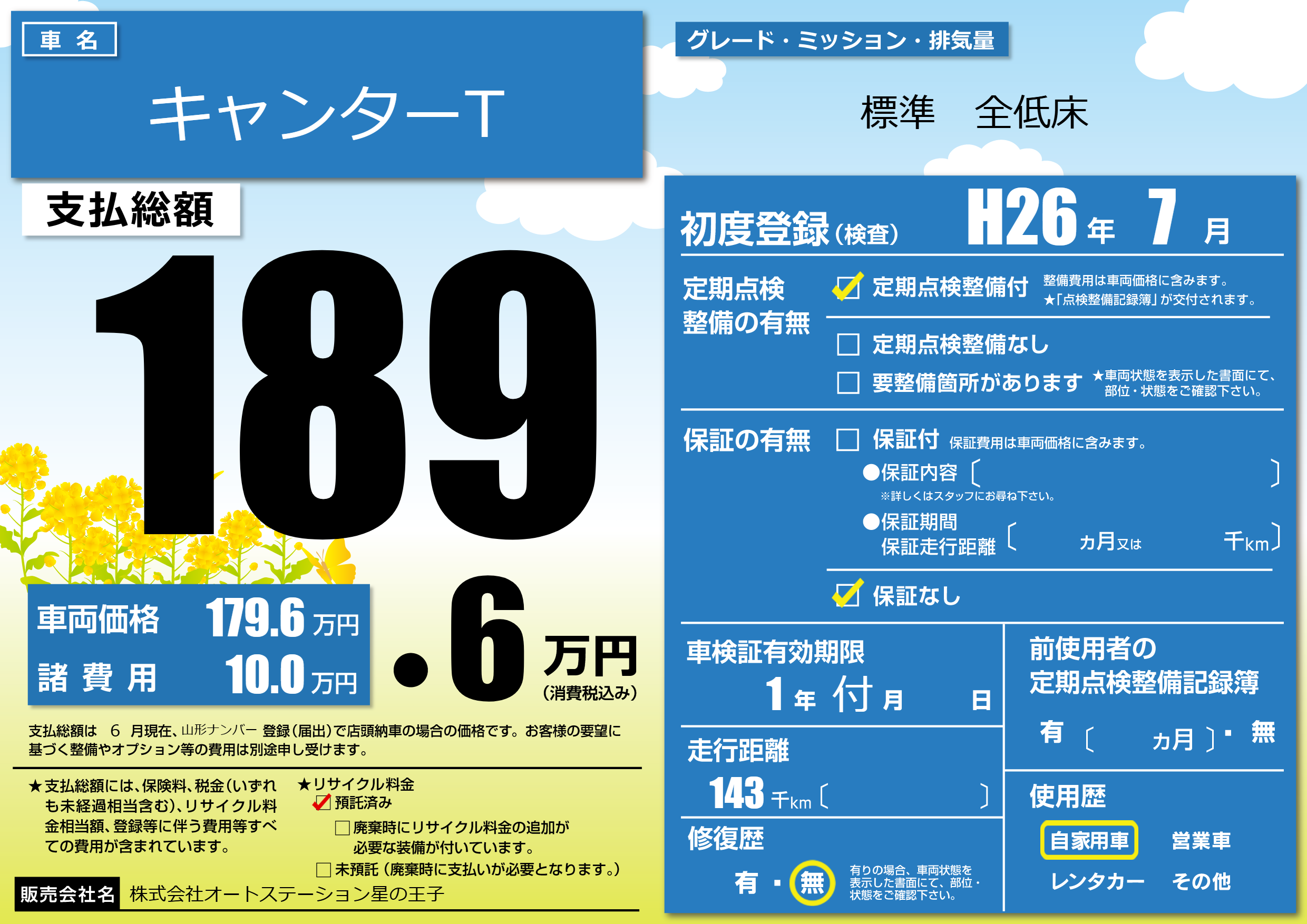 | 走行キロ | 14.3万km | 初年度登録 | H26年7月 |