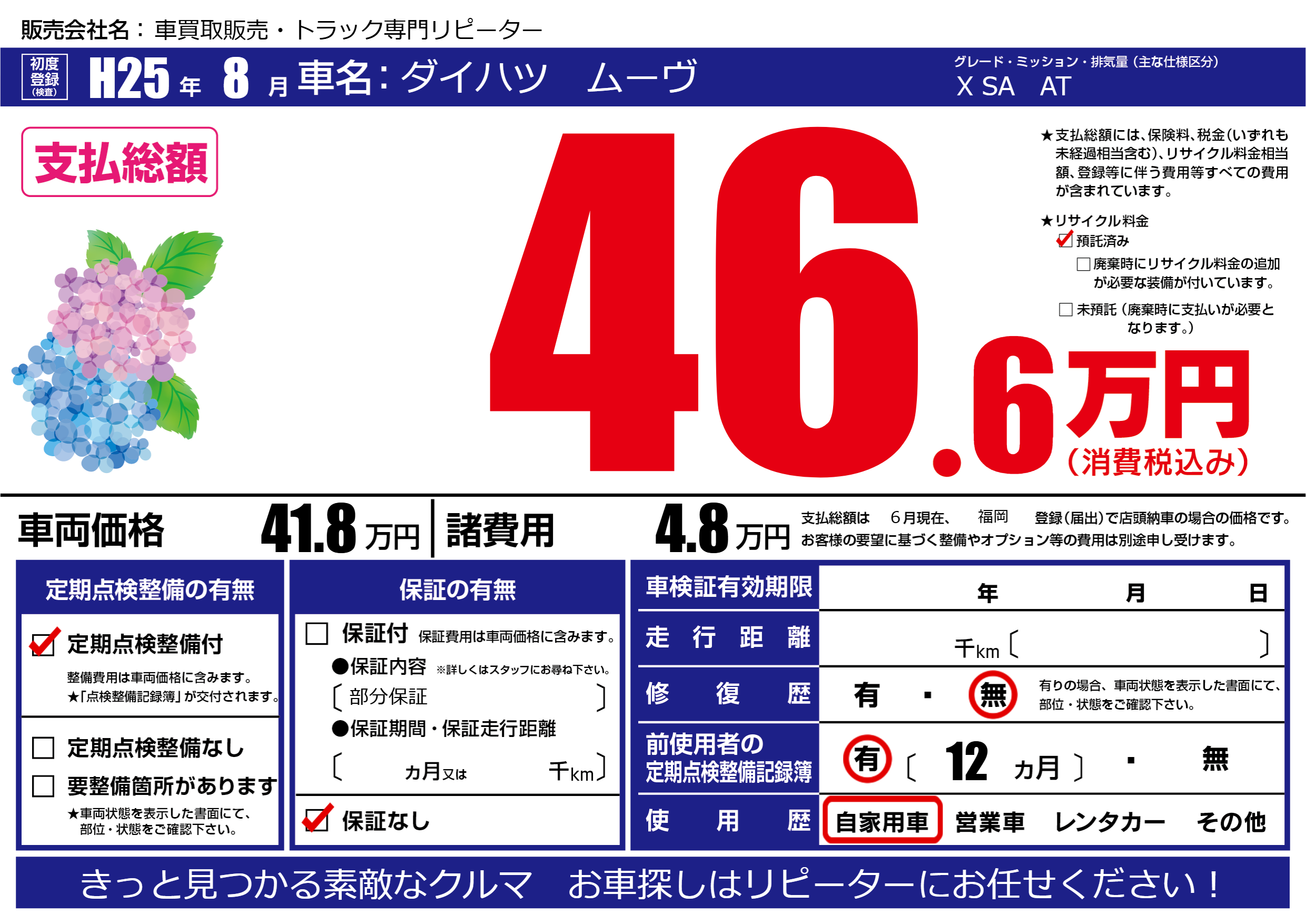 | 走行キロ | - | 初年度登録 | H25年8月 |