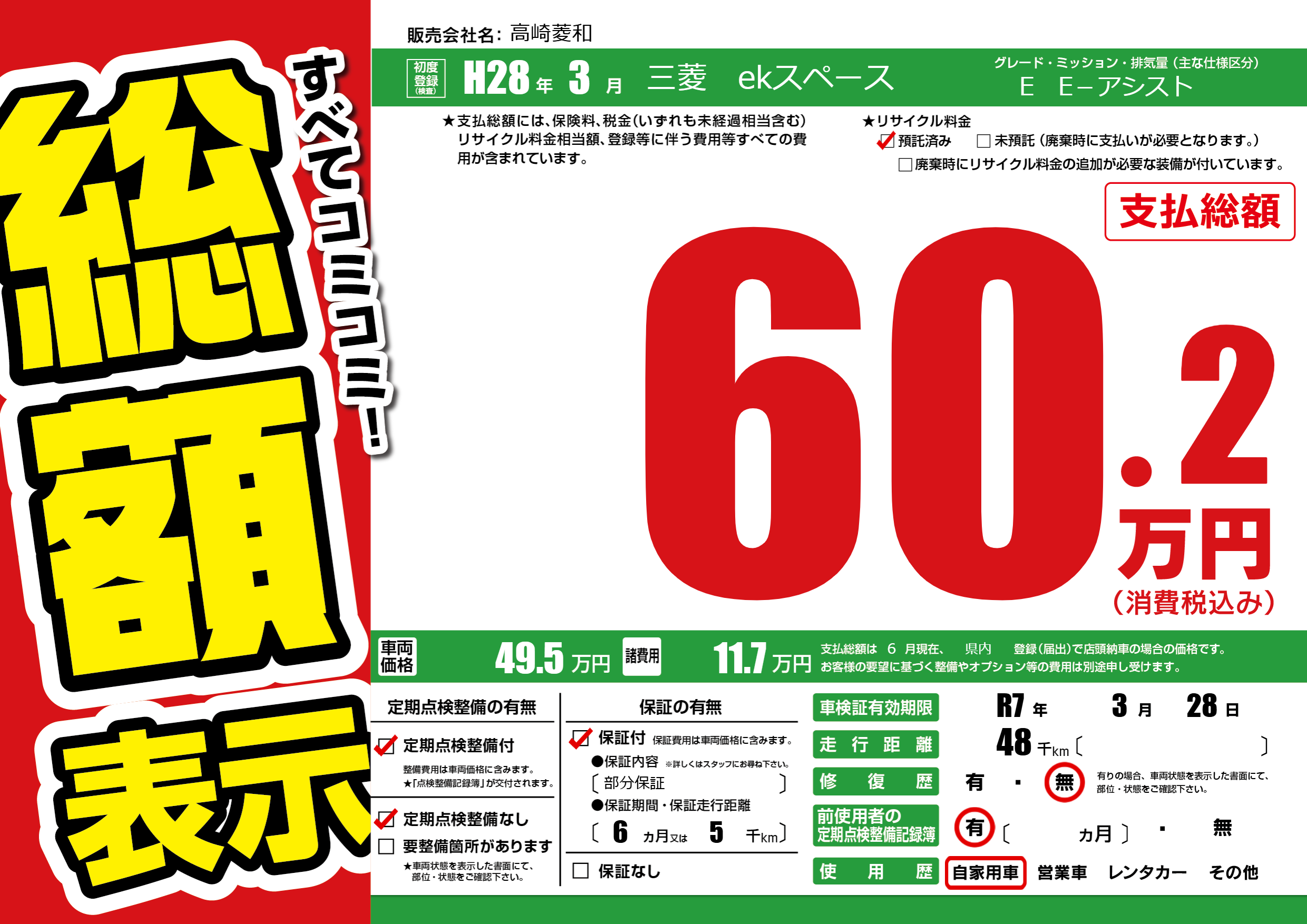 | 走行キロ | 4.8万km | 初年度登録 | H28年3月 |