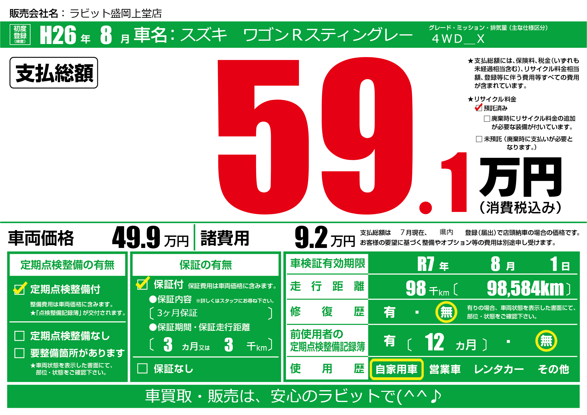 | 走行キロ | 9.8万km | 初年度登録 | H26年8月 |