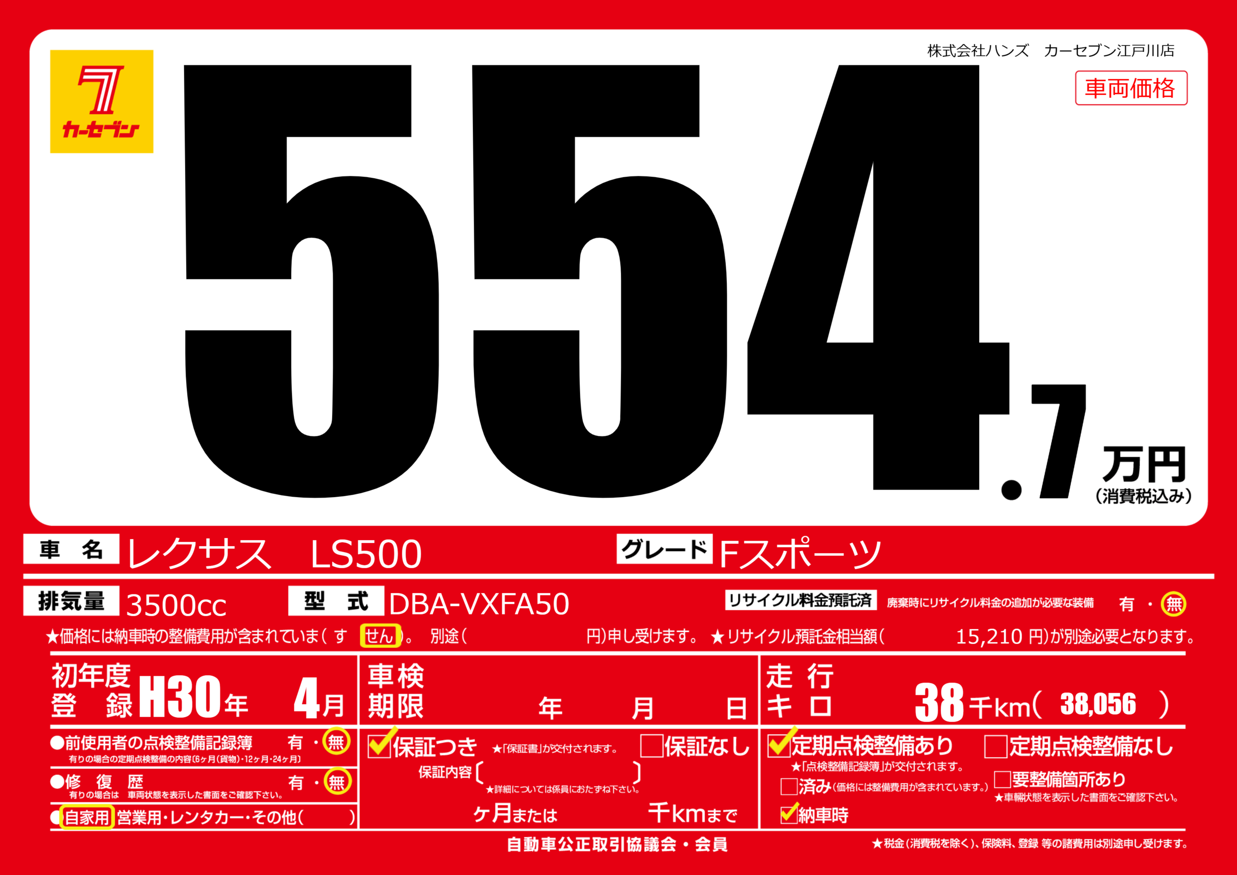 | 車名 | レクサス LS500 | グレード ミッション 排気量 |