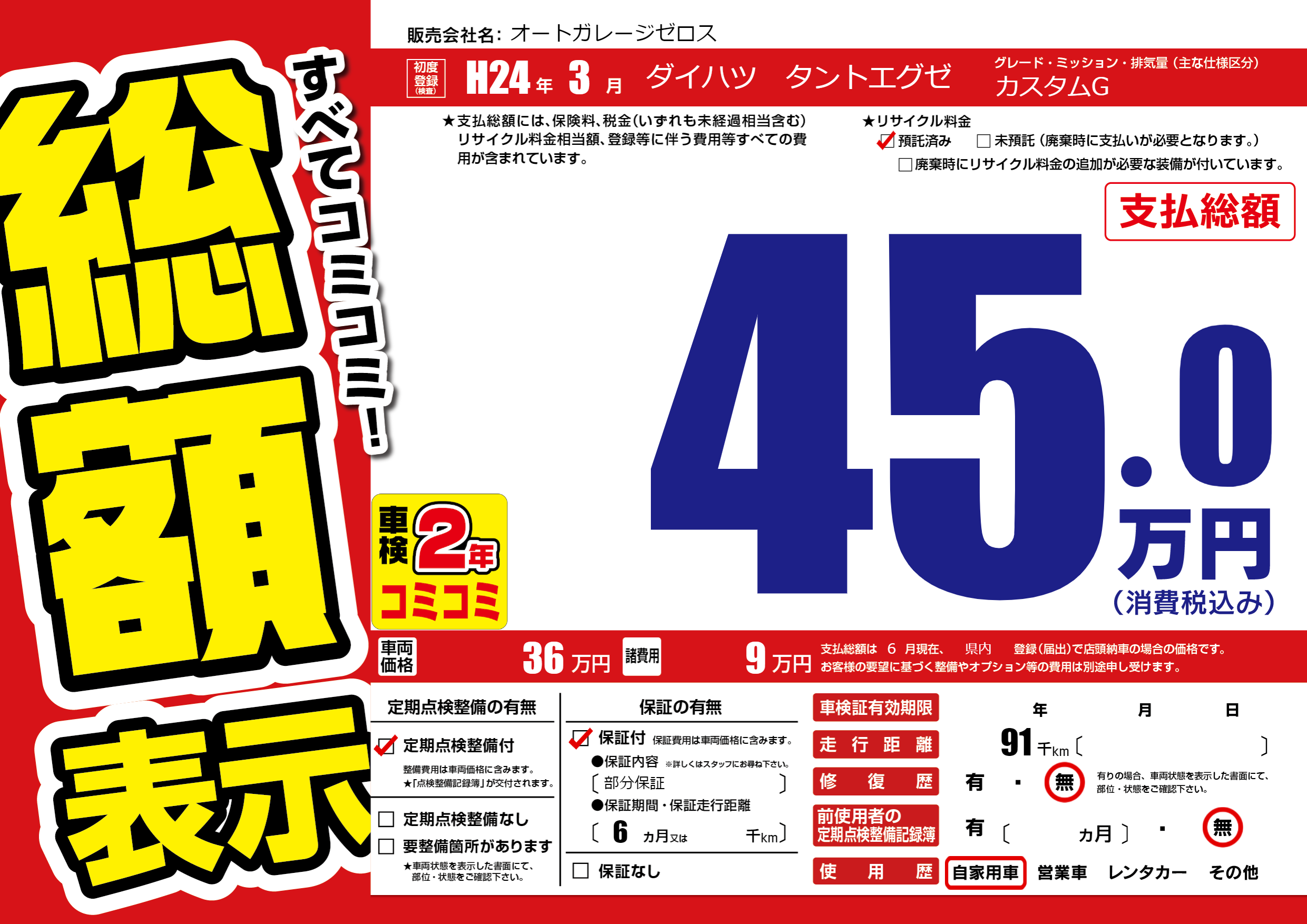 | 走行キロ | 9.1万km | 初年度登録 | H24年3月 |