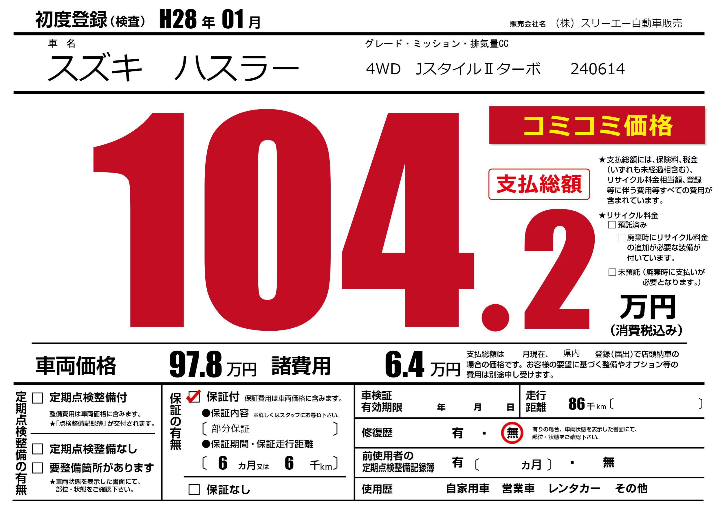 保証付き 保証内容(部分保証) 6ヶ月または(6)千kmまで |