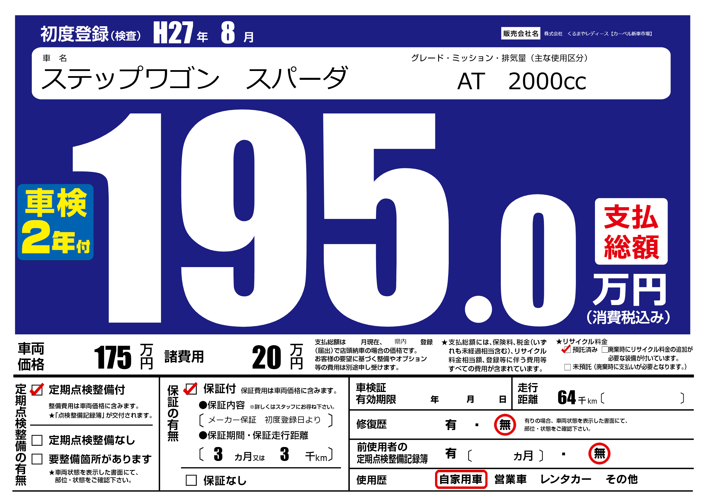 | 走行キロ | 6.4万km | 初年度登録 | H27年8月 |