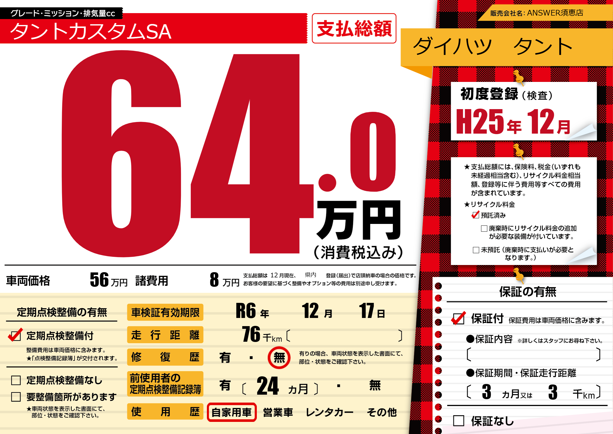 保証付き 保証内容(---) 3ヶ月または(3)千kmまで |