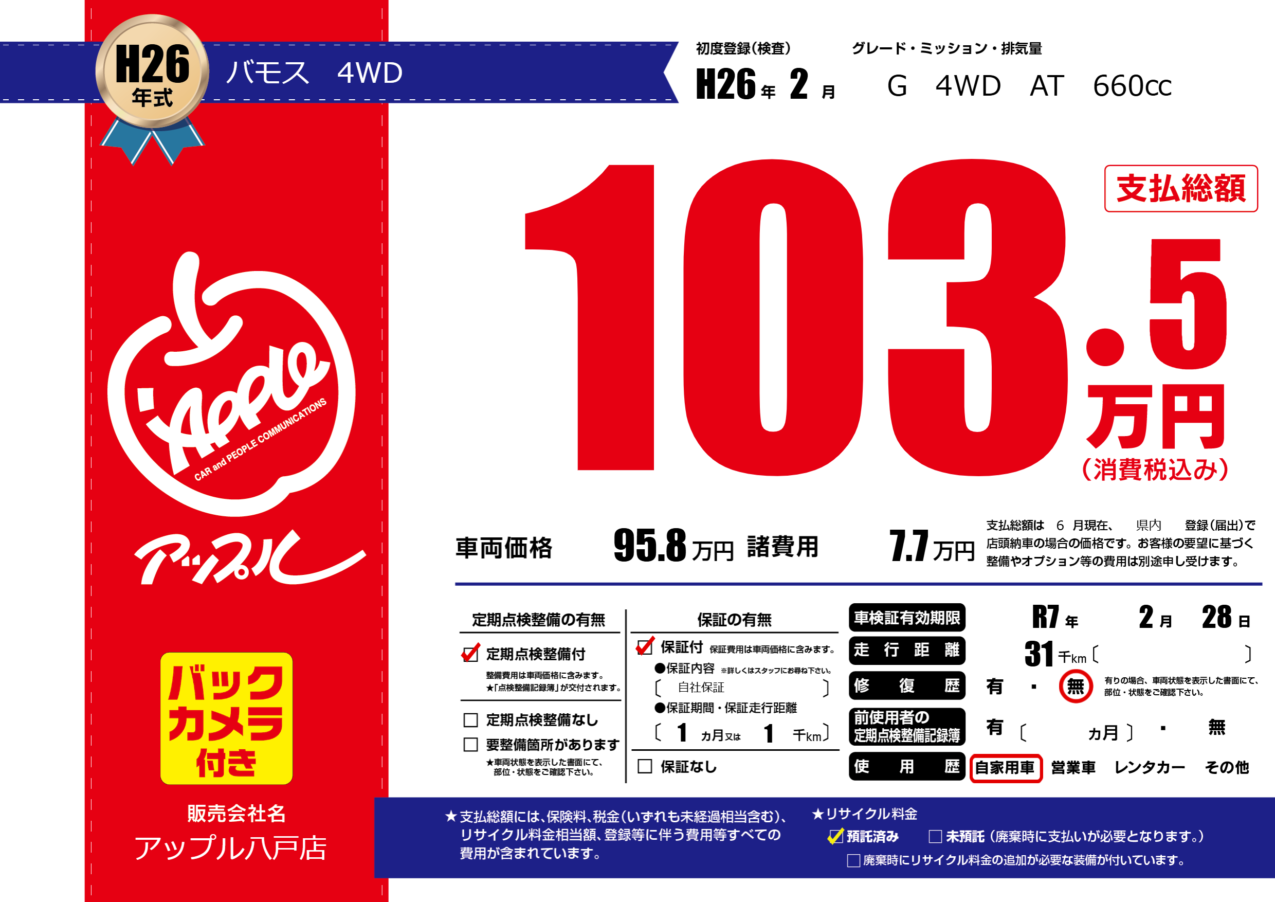 | 車名 | バモス 4WD | グレード ミッション 排気量 |