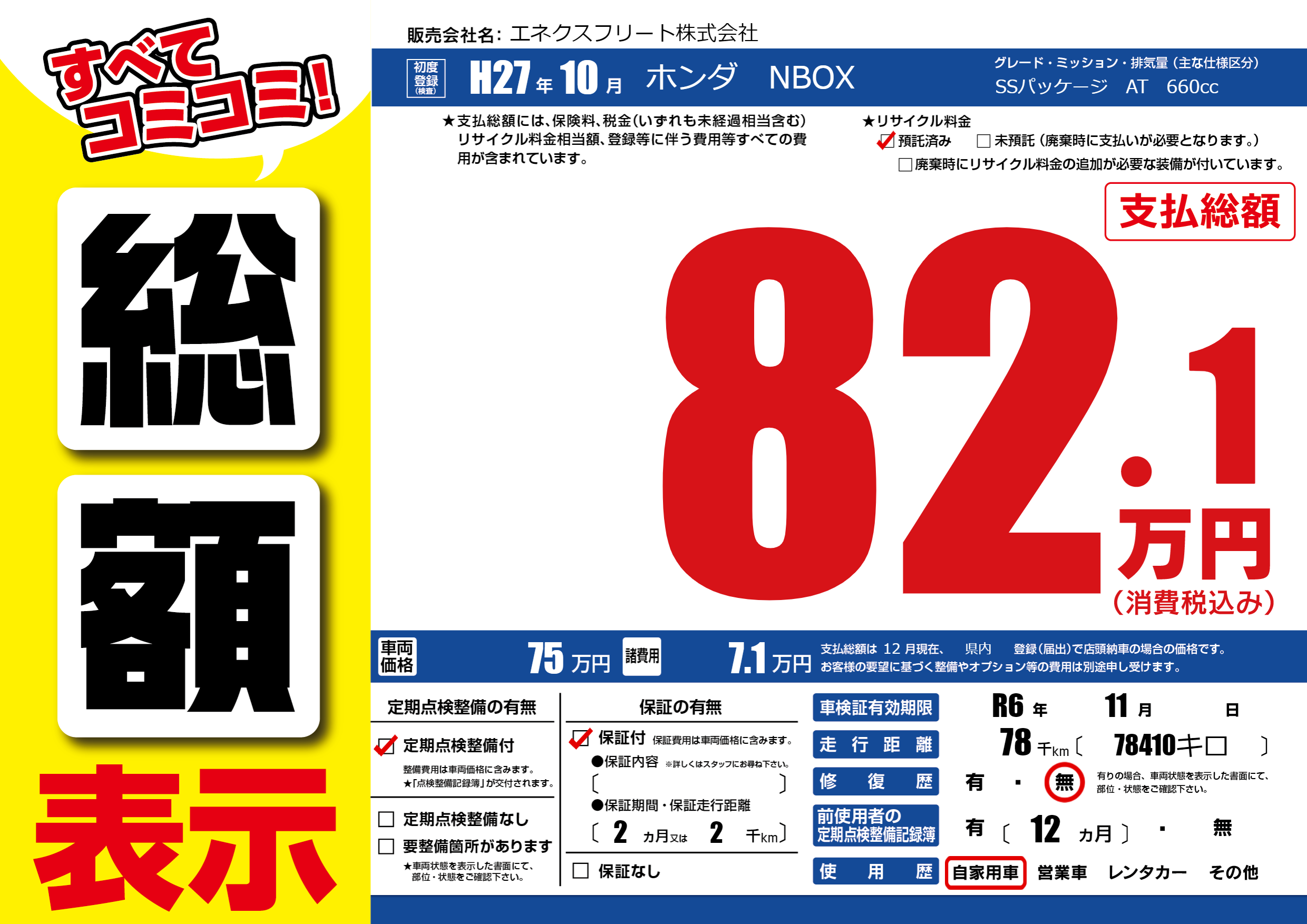 | 走行キロ | 7.8万km | 初年度登録 | H27年10月 |