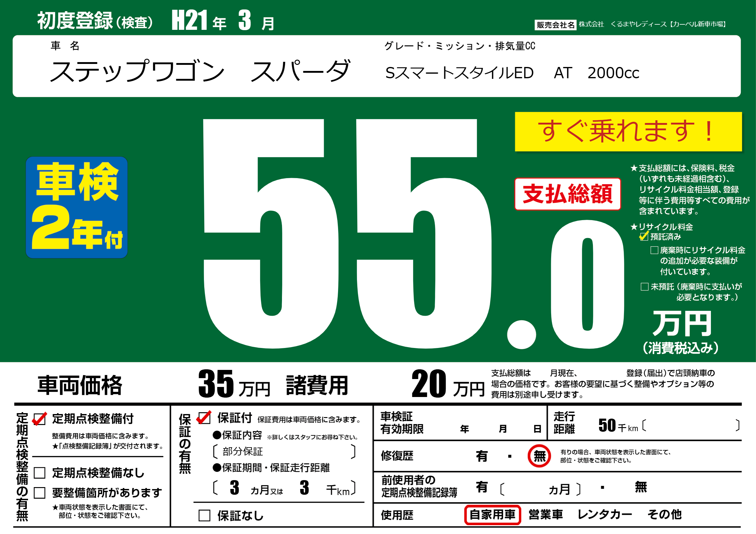 | 走行キロ | 5万km | 初年度登録 | H21年3月 |
