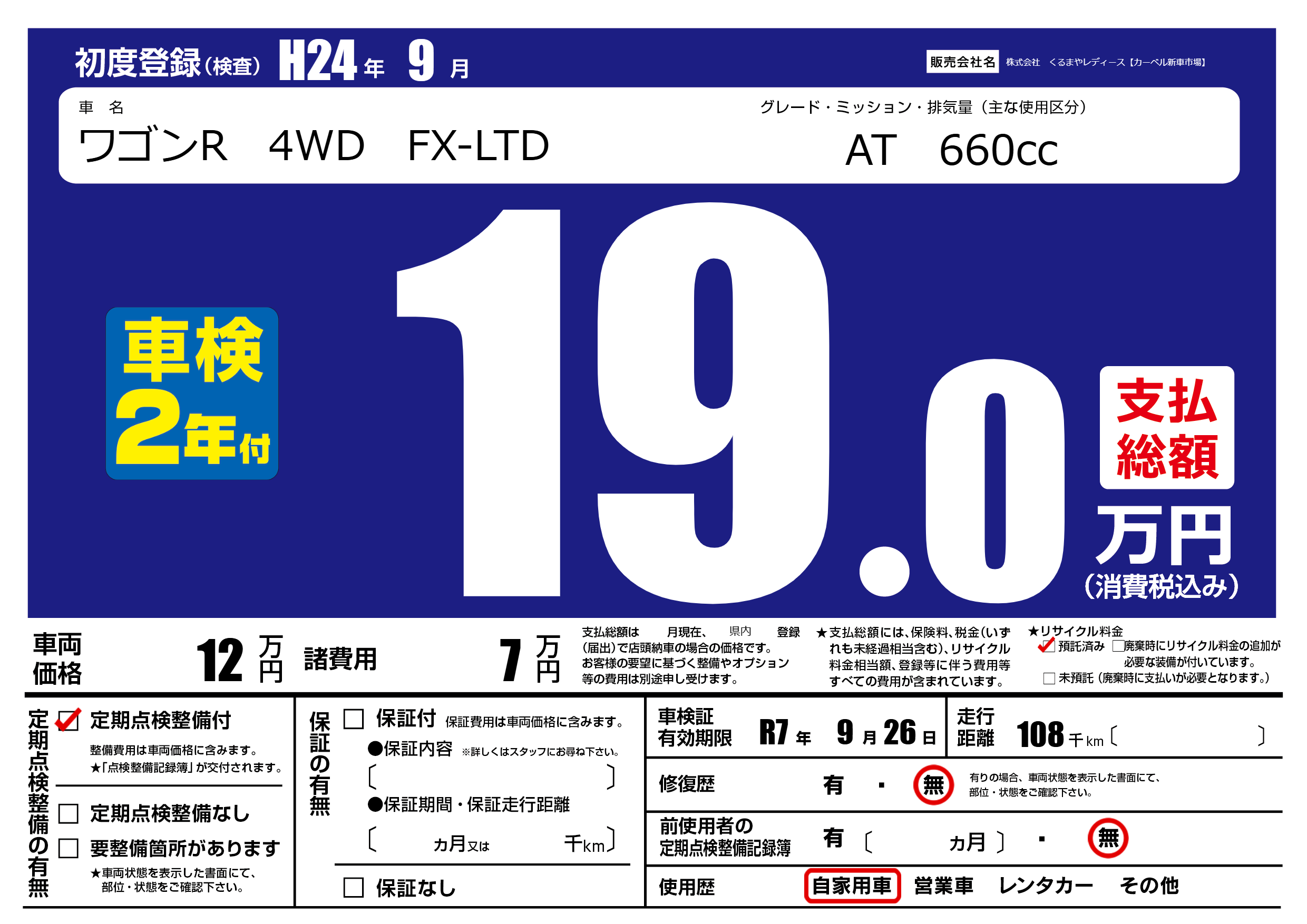| 走行キロ | 10.8万km | 初年度登録 | H24年9月 |