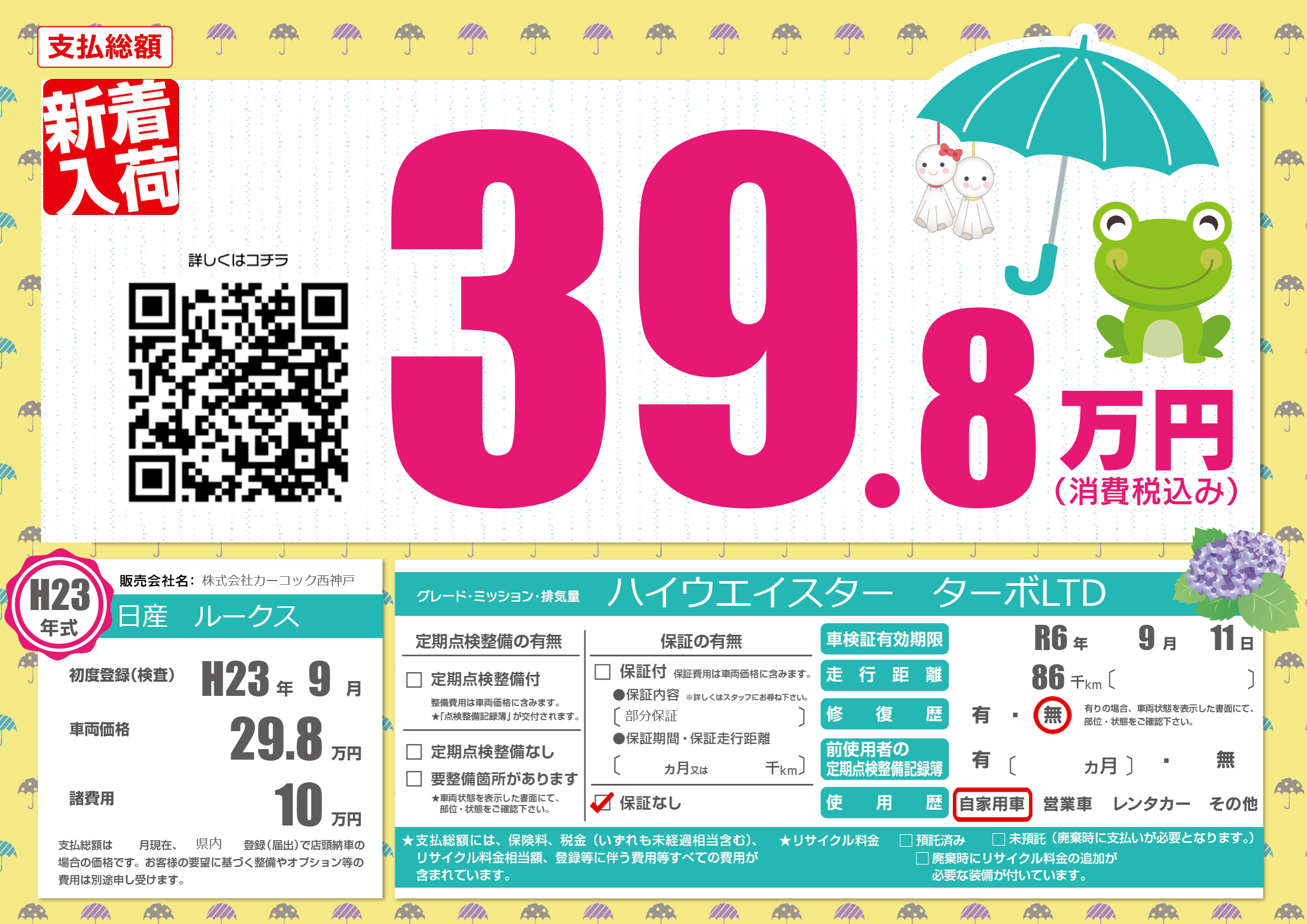 | 走行キロ | 8.6万km | 初年度登録 | H23年9月 |