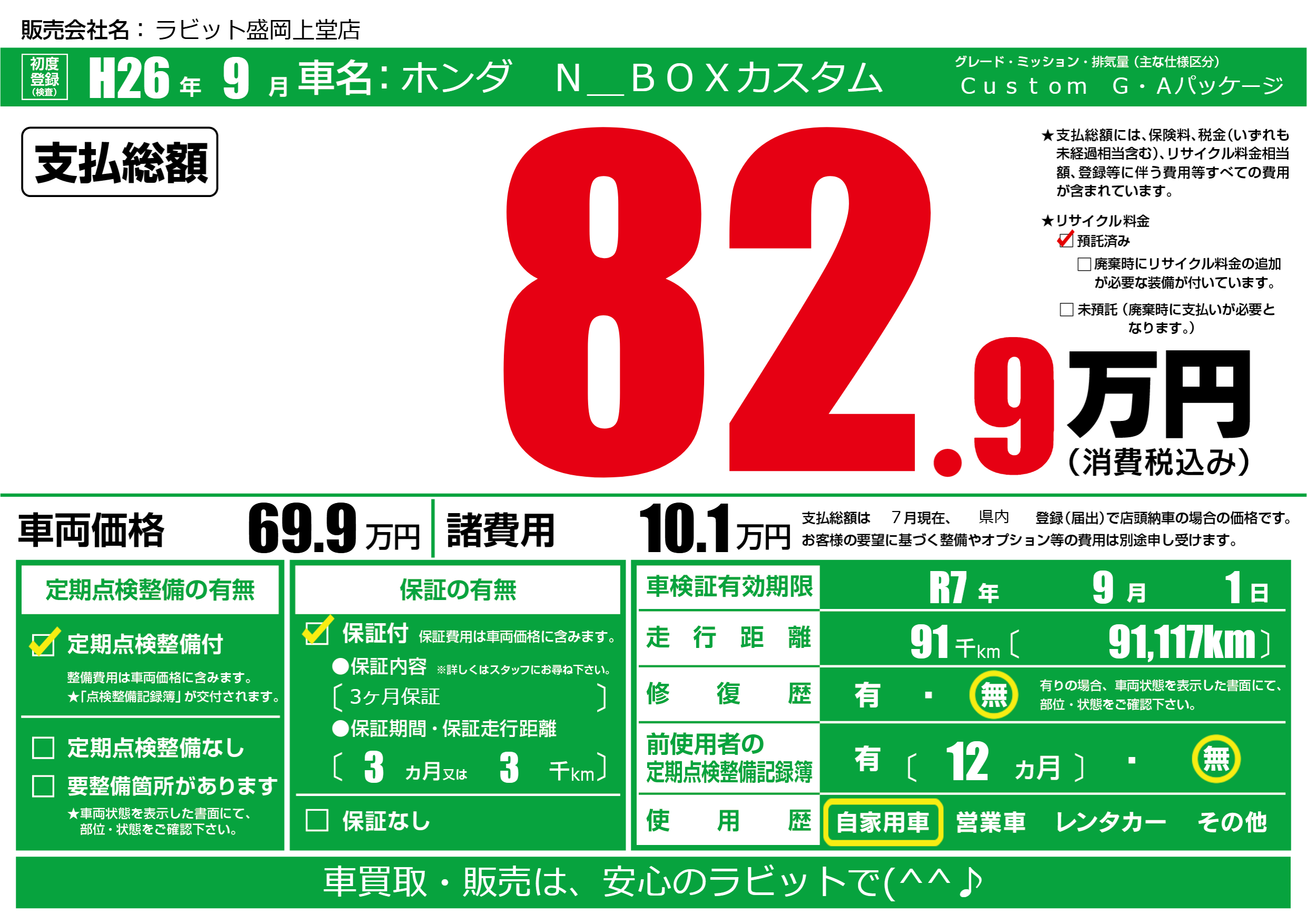 | 走行キロ | 9.1万km | 初年度登録 | H26年9月 |