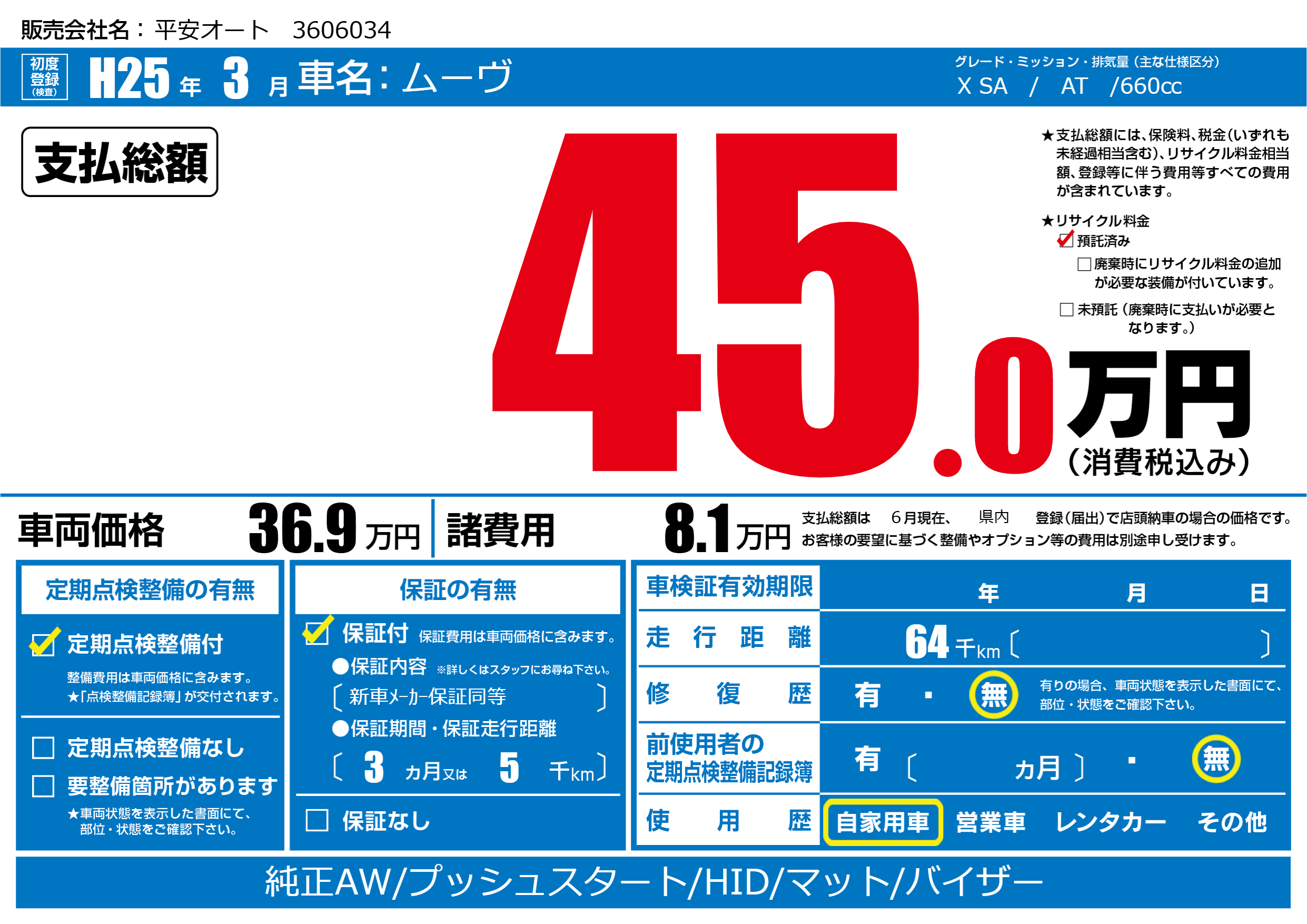 | 走行キロ | 6.4万km | 初年度登録 | H25年3月 |