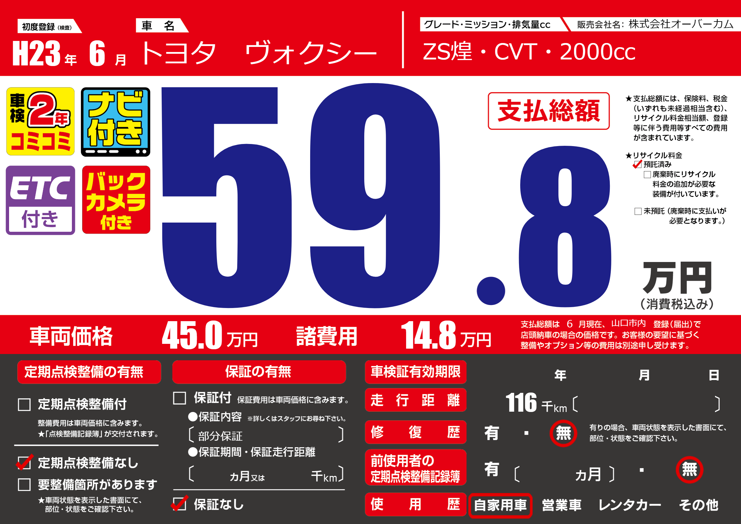 | 走行キロ | 11.6万km | 初年度登録 | H23年6月 |